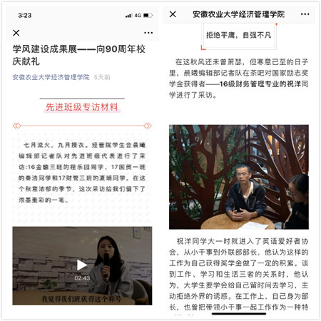 以优秀典型为导向,树立榜样力量。学院重点挖掘学风建设中的优秀典型,采访了获国家奖学金、国家励志奖学金、品学兼优毕业生、先进班级荣誉称号的学生代表,并采取线上推送、线下展示相结合的方式开展学风建设成果展宣传,在全院营造勤奋学习的浓厚氛围,使广大学生学有标尺、赶有目标,也向老师、校友和社会各界展示了安农学子积极向上的精神风貌。
