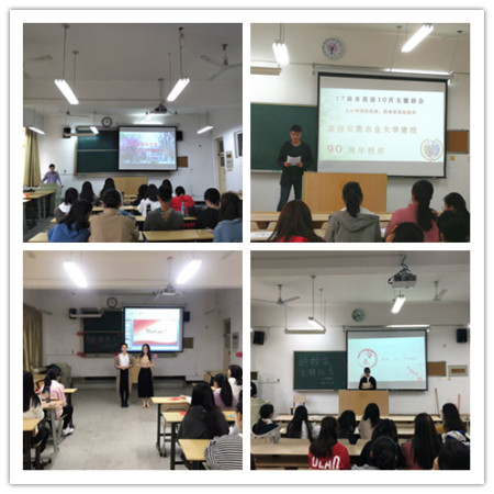 为了庆祝建校90周年,回顾我校办学历程,将学校悠久的历史传承、深厚的文化底蕴、丰硕的办学成果、优秀的典型人物和走“大别山道路”的办学特色在学生中广泛学习、传承,外国语学院在全院上下布置开展“奋进新时代 共筑安农梦”主题班会活动,截止10月30日,全院共召开主题班会22次,700多人参与到班会活动中去。各班级紧密围绕主题,开拓思路,开展了形式多样的主题班会活动,引导班级同学不忘建校初心,牢记使命,争做“一懂两爱”的新时代安农人。