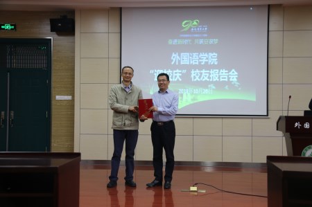 校庆期间,外国语学院2005届英语专业毕业生闫向领、1998届英语专业毕业生孙荣卫分别返回母校并与学院师生交流互动。闫向领与学院师生交流工作体会、探讨对未来的规划。孙荣卫在《沸腾二十年》的校友报告上回顾了自己从在校学习到就业再到创业,从事业攀升到跌入低谷再到成功上市的亲身经历。优秀校友艰苦奋斗、百折不挠的精神感染了在场的每一位师生,他们用自己的实际行动践行了“团结 勤奋 求实 创新”的安农校训。