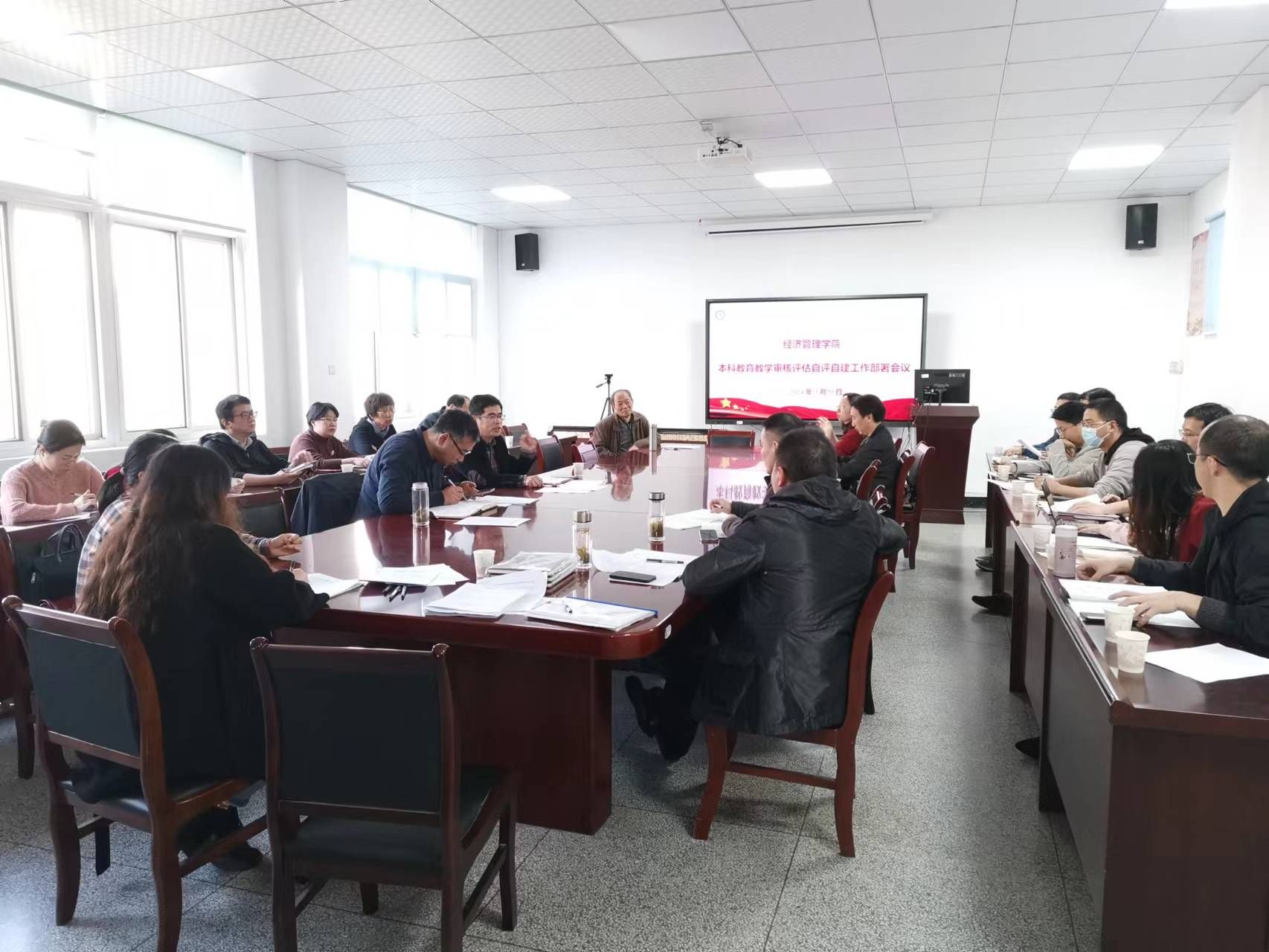 本网讯 为扎实推进本科教育教学审核评估迎评促建工作,进一步明确工作任务及要求,3月29日下午,经济管理学院召开本科教育教学审核评估自评自建工作部署会议。学院院长尹世久,各系主任,专业负责人,督导组长,实验中心主任,教学秘书参加会议,会议由学院副院长田涛主持。