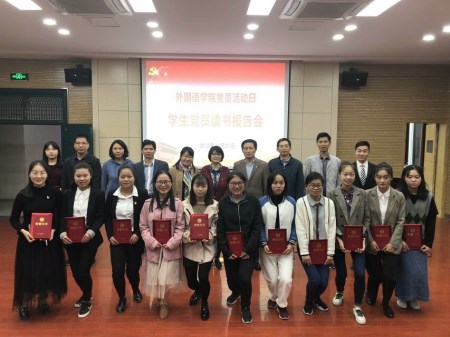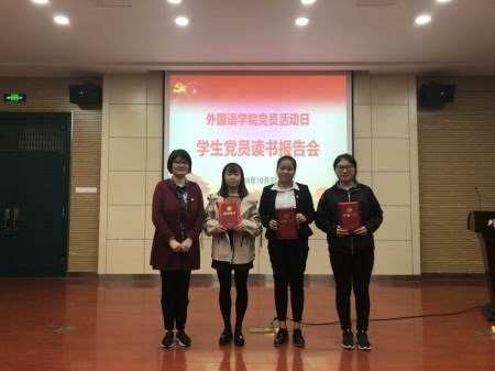 本网讯 为深入学习习近平新时代中国特色社会主义思想,加强学生党员的党性修养和政治理论素养,10月31日晚,外国语学院两个学生党支部举行党员活动日暨2018年读书报告会。校纪委副书记韩平,党委统战部部长、机关一总支书记刘惠东,党委宣传部副部长夏成云、招生就业处副处长沈兆梅、校党委组织部副处级组织员江海波担任活动评委,学院党政领导姚莉、黄庆华和学生党支部全体师生党员、发展对象、第56期入党积极分子培训班学员等参加了此次活动。