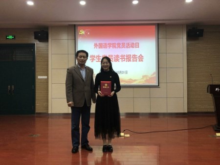 今年学生党员读书报告会结合党员活动日,向全体学生党员推荐了涉及党建思想、人文社科、中国传统文化等方面的书籍,并通过充分动员,让每名学生党员选择两本作为自己的阅读书籍。9月中旬,各学生党支部分党小组开展阅读分享并选拔优秀的同学参加全院的报告会。两个学生党支部共选拔出12名学生党员,他们通过PPT向各位党员阐述了自己在阅读中的收获以及对于自身学习生活、就业工作等方面的启示。每位党员从自身实际出发,阐述了读书意义、感悟了自身成长、反思了存在不足、确立了奋斗方向,不断引发在场师生的共鸣,获得阵阵掌声。来自2015级英语班的陈彭欣同学获得一等奖。