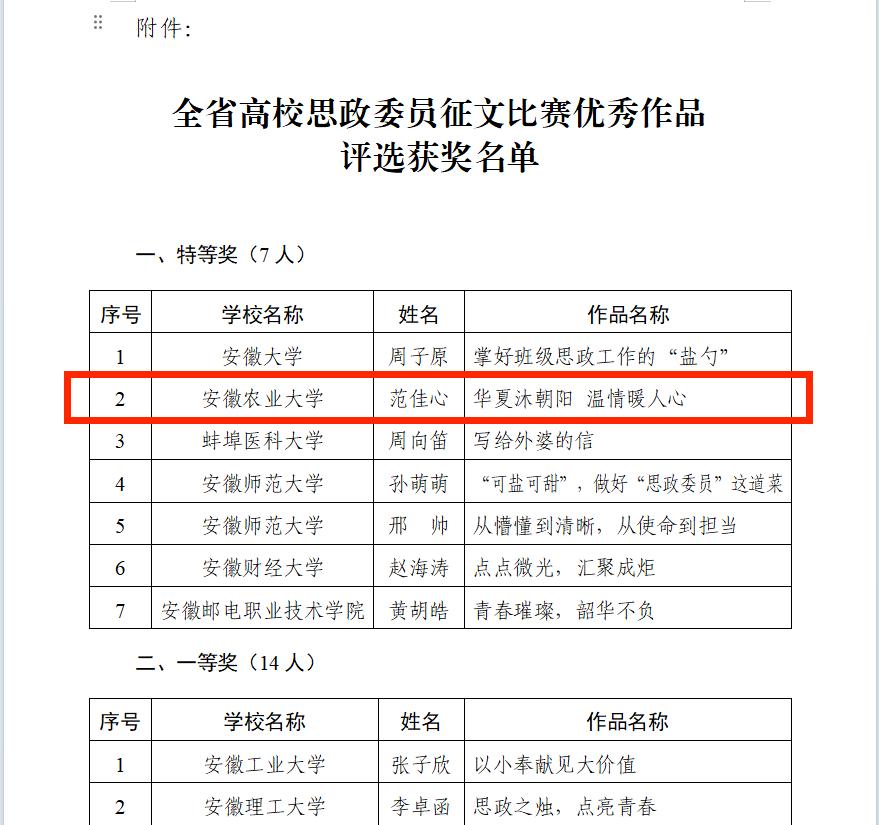 本网讯 近日,由安徽省高等学校思想政治教育研究会举办的全省高校班级思政委员征文比赛评选结果公布。人文社会科学学院范佳心同学《华夏沐朝阳 温情暖人心》荣获特等奖,人文社会科学学院范学松同学《百炼成钢——在思政工作锤炼红色信仰》荣获三等奖。
