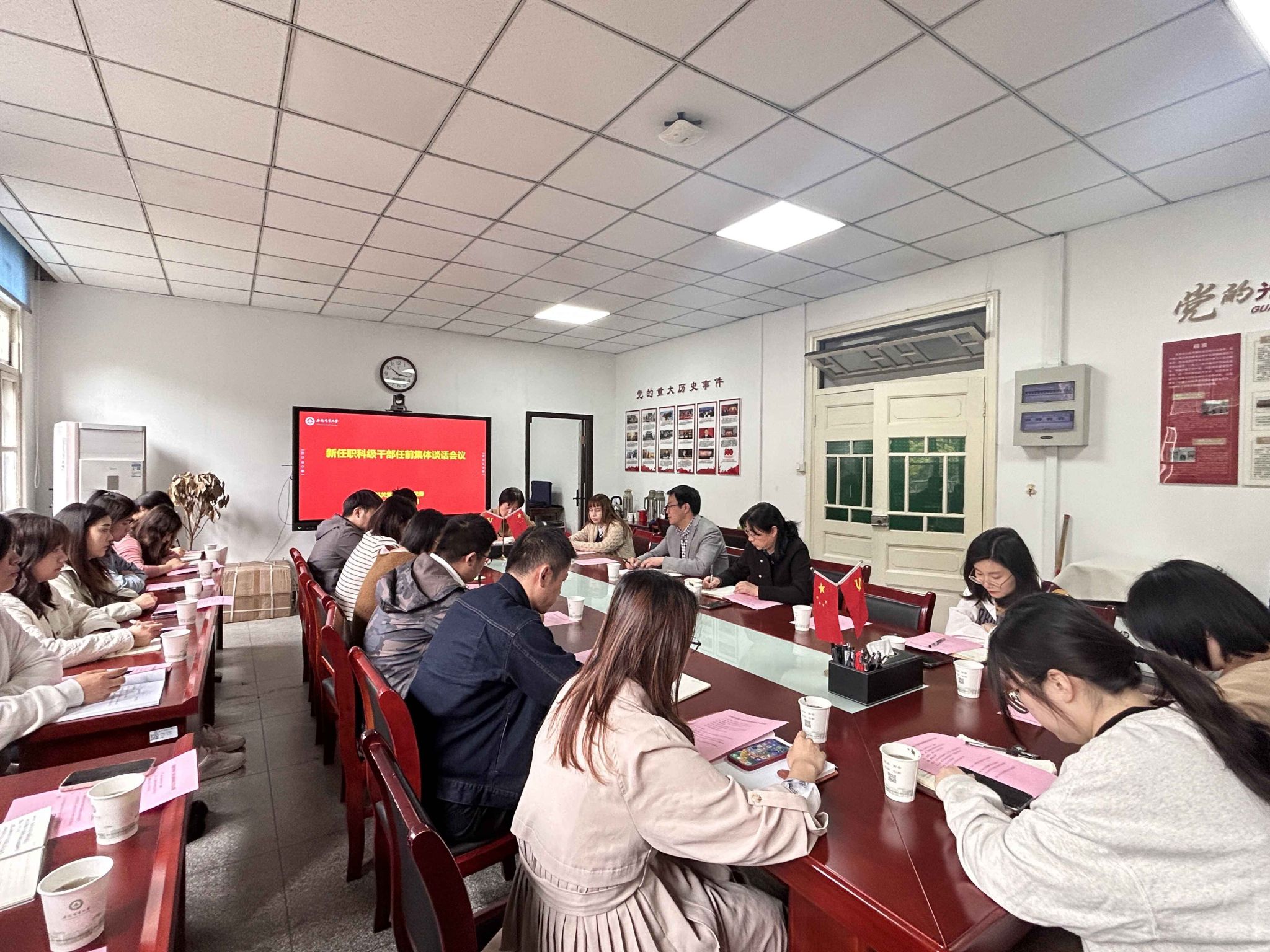 会议指出,召集新提任的科级干部进行任前集体谈话,既是干部任前的必经程序,也是干部队伍建设的需要,目的在于对新提拔任职干部加强教育,从而在今后的工作中更好地履行职责。并从四个方面对新提任的科级干部提了要求,政治上要过得硬,做到对党忠诚、坚持原则、顾全大局;工作上要创一流,敢负责、会协调、善创新;自身上要立得住,强理论、提业务、重实践;廉政上要守得住,时刻保持清醒的头脑,不为名所累,不为利所缚,不为权所动,不为欲所惑。