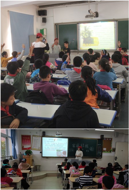 志愿服务队成员从家庭绿植养护、花卉种植、蔬菜育苗等多个方面开展不同类型的绿色课堂。课堂上有PPT展示、移栽动作示范、亲手教授、现场手工、知识问答等多项环节,课堂氛围真实自然、生动活泼,为孩子们带来了趣味绿色体验。