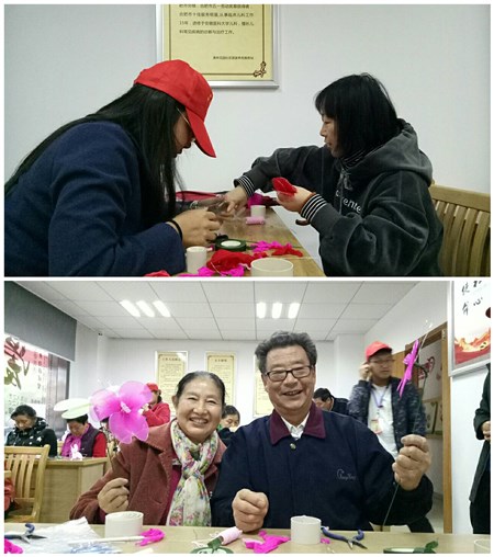 爱心丝网志愿服务。丝网花是园艺学院的特色文化产品之一,10月份以来,学院志愿者们将它带进社区与老人一起“编织幸福”。