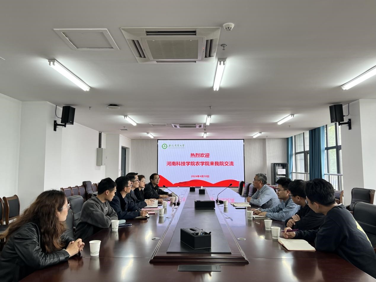 冯峰首先对杨文平的到来表示热烈欢迎,对学院基本情况和应届博士研究生就业情况作了简要介绍。宋贺希望两院在研究生培养、人才队伍建设等方面加强合作、优势互补,实现双方互利共赢。杨文平简要介绍了河南科技学院农学院近几年在科研和研究生培养等方面取得的成果,并希望两院今后在人培养、人才引育和社会服务等方面深入交流,拓宽合作领域、提升合作层次。