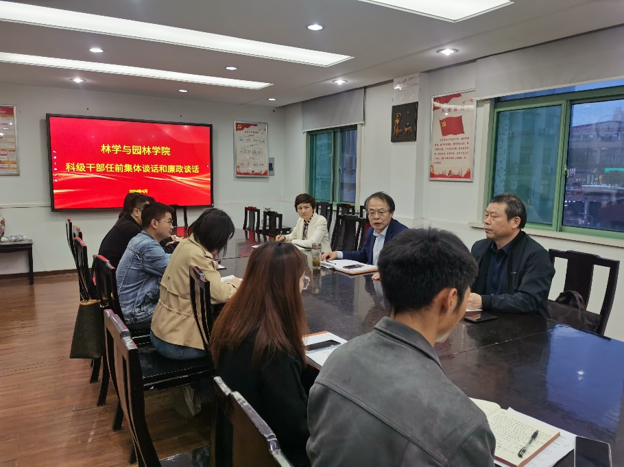 本网讯 4月17日下午,林学与园林学院在学院二楼会议室召开提任科级干部任前集体谈话和廉政谈话。学院党委书记江正君,学院党委副书记、院长徐斌,学院党委副书记、纪委书记夏利明出席会议,新提任的8名科级干部参会。会议由江正君主持。