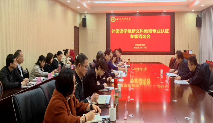 本网讯 4月17日下午,外国语学院邀请安徽工程大学外国语学院原院长金成星教授、副院长李新国教授参加新文科教育专业认证专家咨询会。外国语学院党委副书记、纪委书记姬惠惠,副院长张文静,学校教务处工作人员、学院英语系相关教师及全体行政管理人员参加了咨询会。会议由副院长许宗瑞主持。