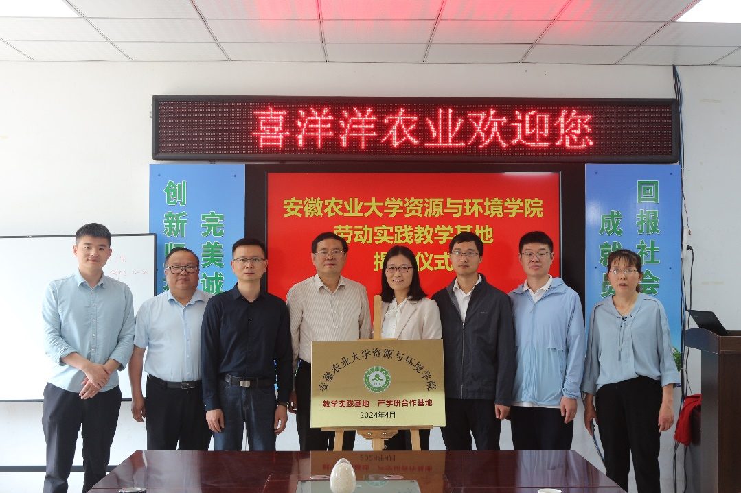 本网讯 为深化校企合作,推动产学研深度融合,4月26日上午,资源与环境学院教学实践基地揭牌仪式在安徽喜洋洋农业科技有限公司会议室举行。资源与环境学院副院长唐俊教授、农业资源与环境学科师生代表、公司董事长王宜坤等出席揭牌仪式,教学实践基地负责人与公司签署校企合作协议,唐俊代表学院向公司授牌。