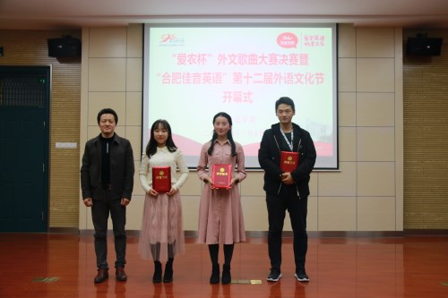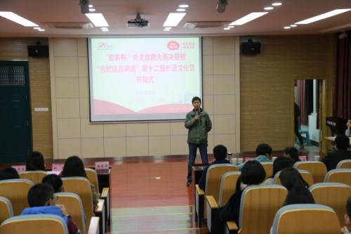 本网讯 11月14日晚,第十二届“爱农杯”外文歌曲大赛决赛暨外国语学院第十二届“合肥佳音英语”外语文化节开幕式在外语楼502举行。学院党委副书记黄庆华,合肥佳音英语人力资源部老师,校团委和部分专业课教师以及学院两办老师等参加了晚会。