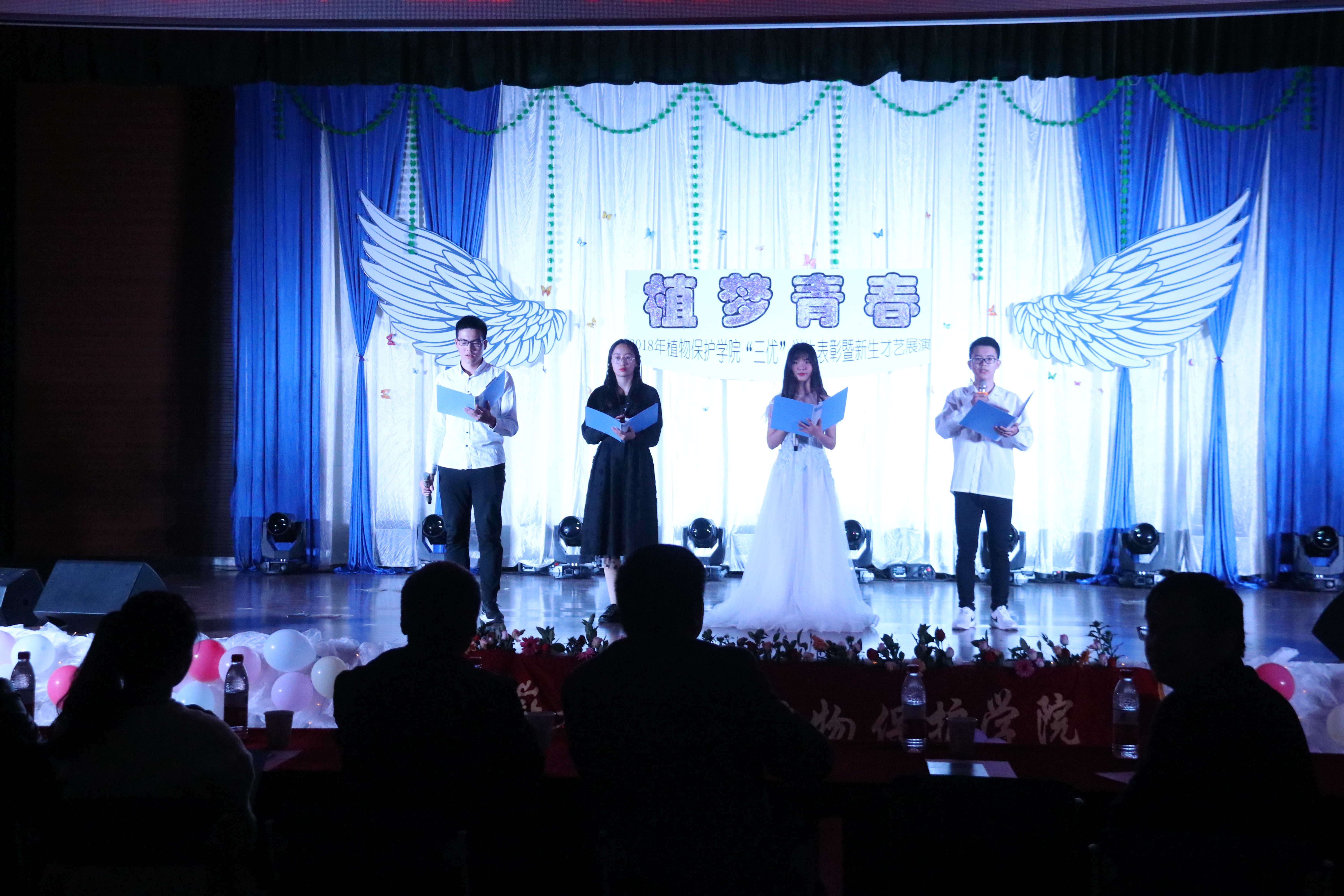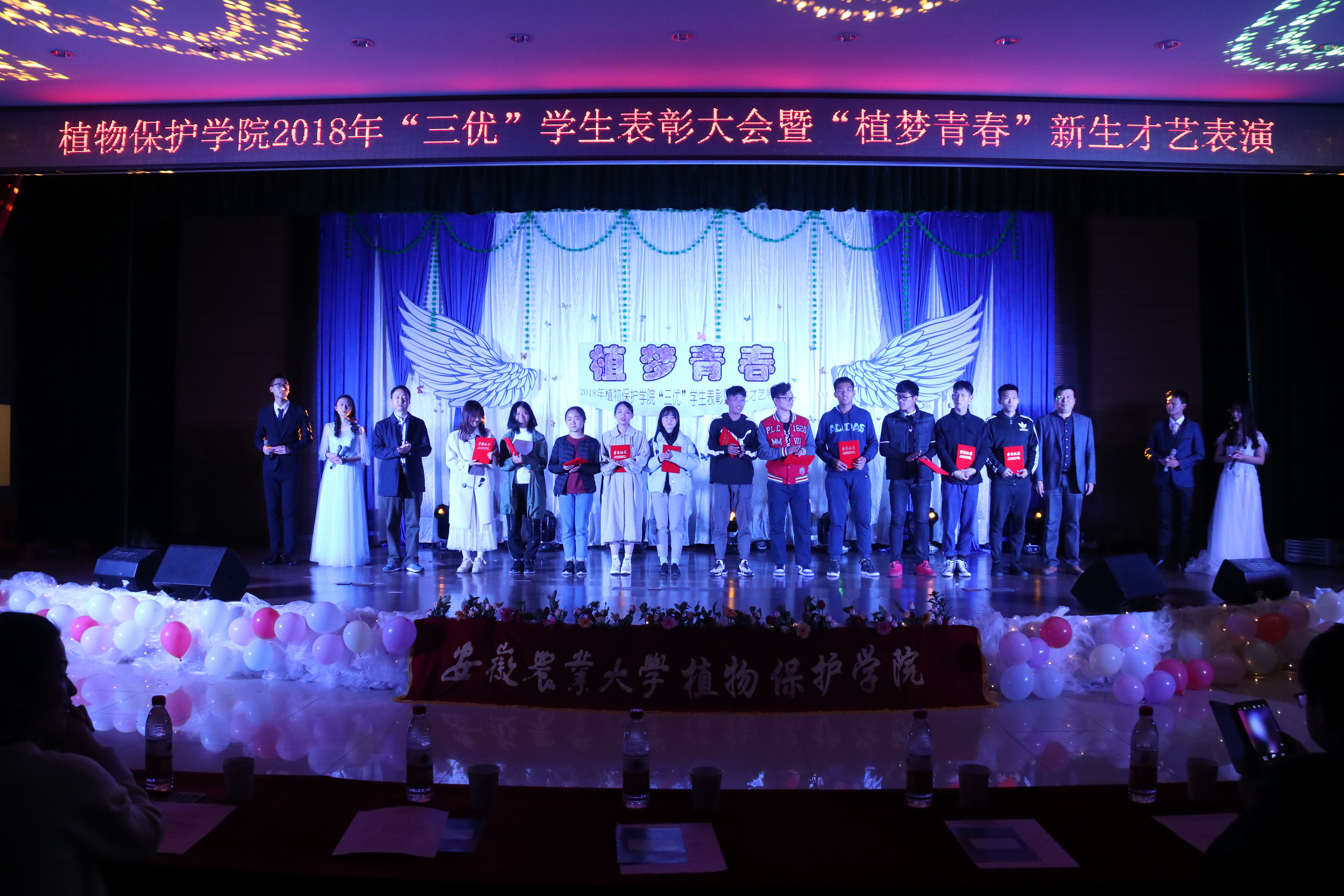 本网讯11月24日晚,植物保护学院在欣苑学生活动中心举办2018年“三优”学生表彰大会暨“植梦青春”新生才艺展演。校学工部(处)部长彭庆刚、教务处副处长李玮、校团委副书记任琪、组织部副处级组织员江海波和学院领导檀根甲、潘月敏、戴照力为获奖学生颁奖并观看演出。