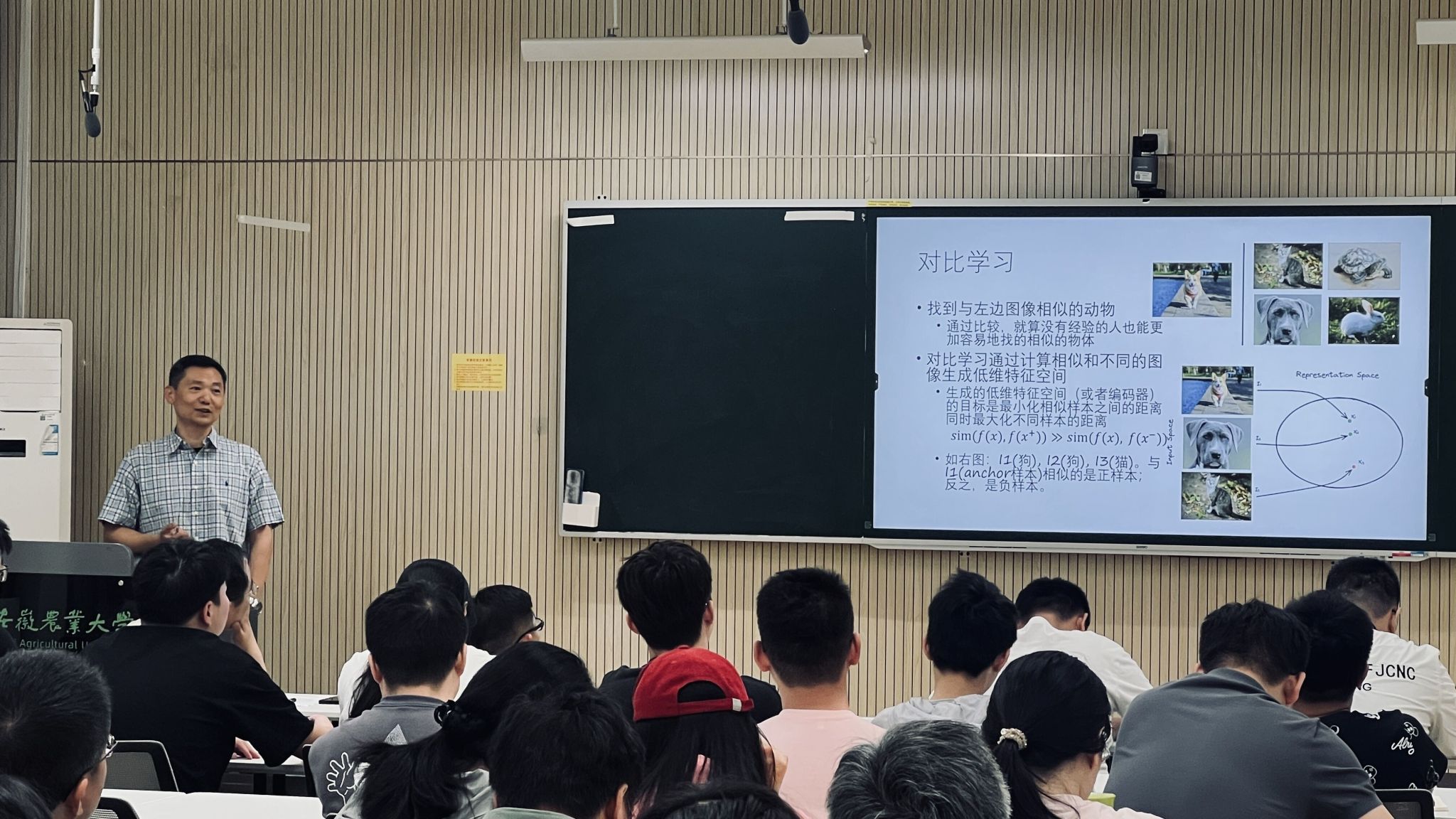 本网讯 时值“培育新质生产力 推动农业科技创新”学术活动月,5月15日下午,信息与人工智能学院在信智楼305会议室举行2024年度第二期智慧耕“云”学术沙龙活动。活动邀请了美国北德克萨斯大学计算机视觉和智能系统实验室主任袁晓辉副教授作了题为《深度对比学习及应用》的学术报告。学术沙龙由学院副院长饶元主持,60余名师生参加了学术沙龙。