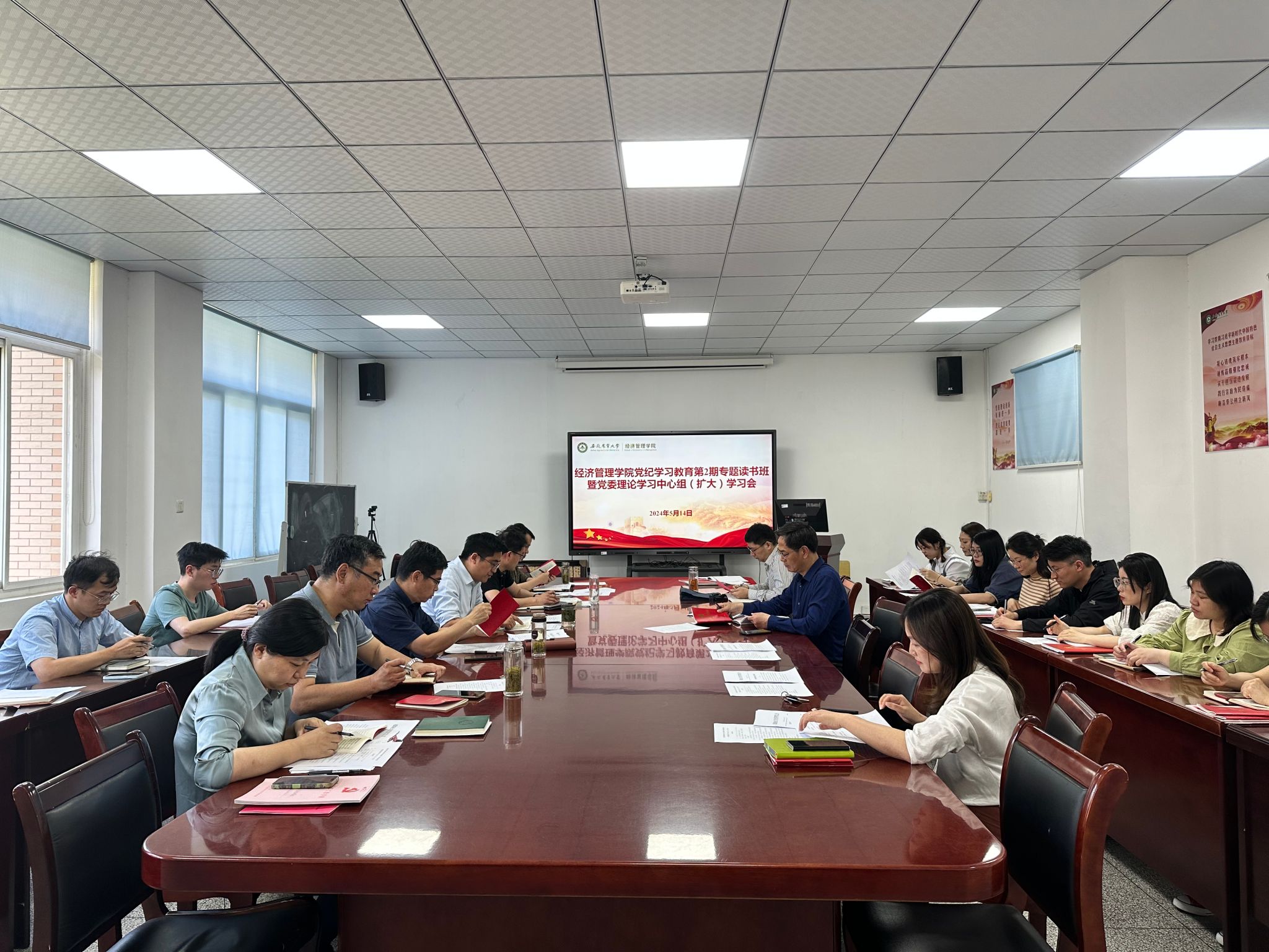 本网讯 5月14日下午,经济管理学院在经管楼304会议室召开党纪学习教育第2期专题读书班暨党委理论学习中心组(扩大)学习会。学院领导班子、党委委员、党支部书记参加了本次会议。会议由学院党委书记吴国卿主持。