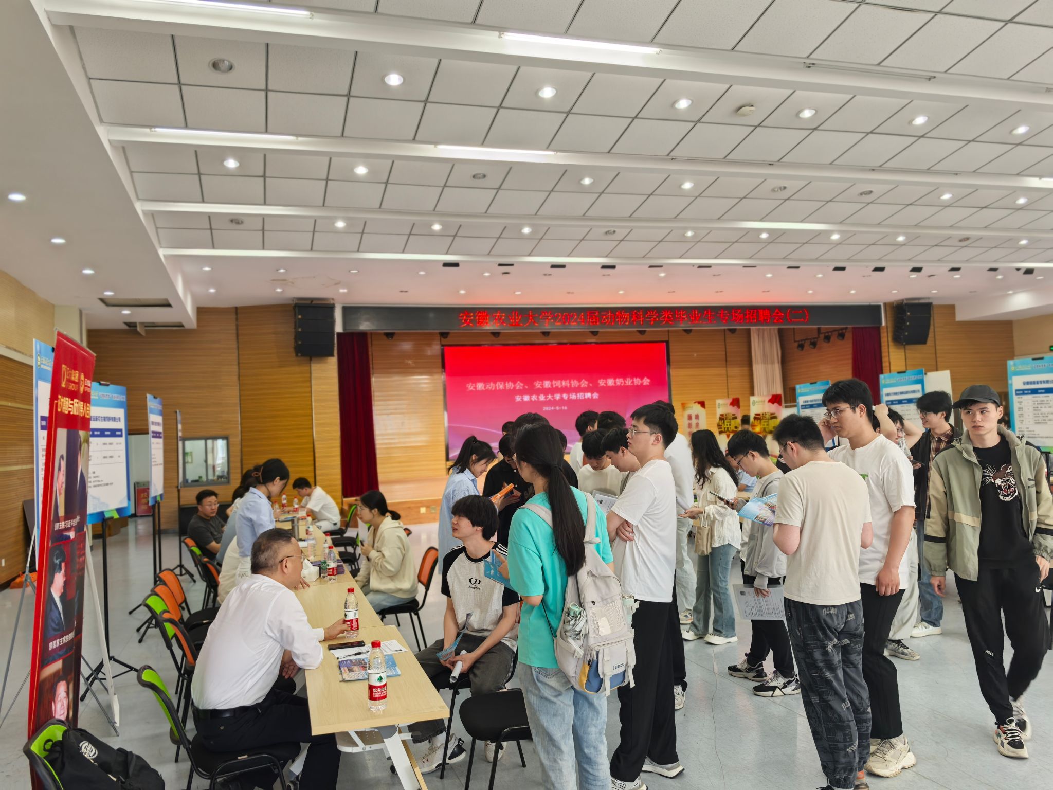 本网讯 5月16日上午,安徽农业大学2024届动物科学类第二场专场招聘会在欣苑四楼大学生活动中心隆重举办,此次招聘会由安徽动保协会、安徽饲料协会、安徽奶业协会等牵头,动物科技学院协助举办,学院领导班子和相关协会会长到现场指导并与用人单位、校友、毕业生亲切交流。