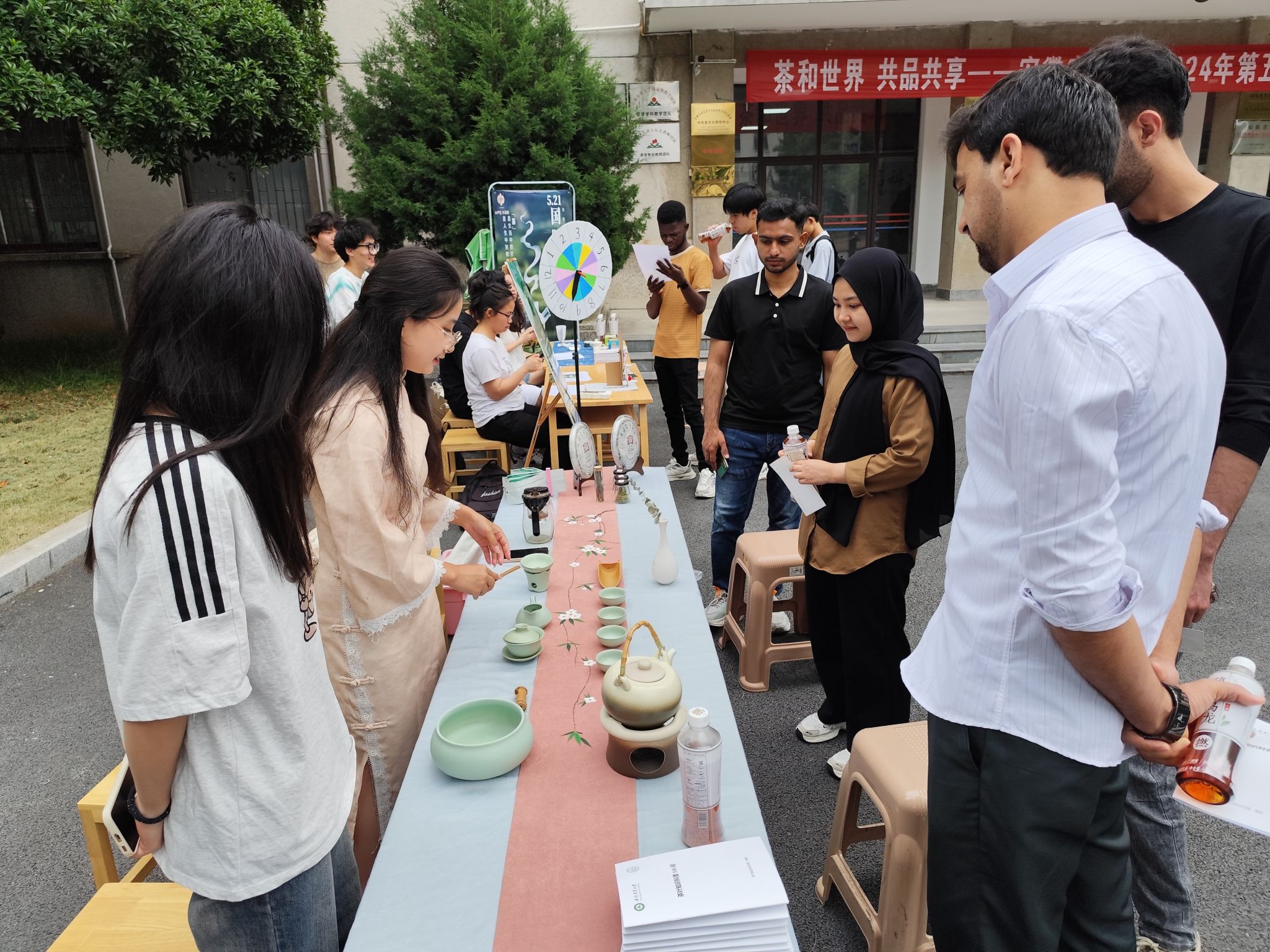 本次活动统筹安排了“美美与共”品茗会、“美美共享”茶席设计展、“美美同悦”《饮茶与健康》公开课、“中华茶饮 五洲共享”中外(留学生)学子茶叙畅饮、“廉美合欢 人间清欢”廉洁教育及茶廉文化对联书法、“以茶为乐,谜以为趣”猜茶谜心理素质拓展活动等众多内容。在茶业楼门前以及三楼茶艺室,茶桌摆列整齐、茶席设计秀美,茶艺师冲泡技艺温润优雅,多种品类茶叶精彩呈现,师生以茶为媒,坐饮茶香,共品佳茗,共叙茶道,共话人生,共享美好时光......上午的活动现场,学院还同时发放了自编的《茶叶知识科普100问》科普手册。在下午的《饮茶与健康》公开课现场,户杉杉博士用通俗的语言和具体的案例,为同学们介绍了茶的起源、茶叶分类、茶与健康的关系,受到同学们一致好评和阵阵掌声。