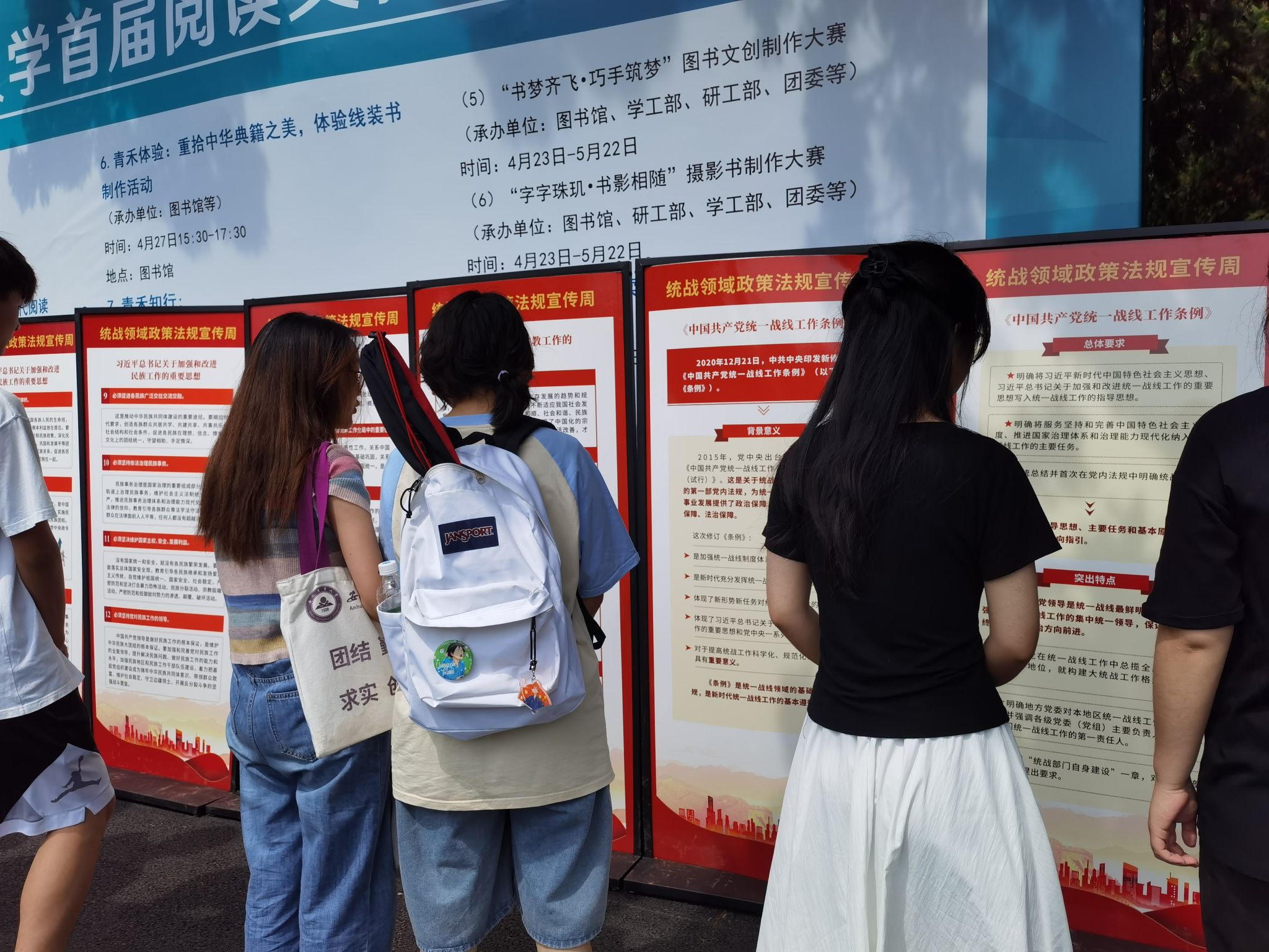 本次图片展以贯彻落实习近平总书记关于做好新时代党的统一战线工作的重要思想为主题,内容涵盖《中国共产党统一战线工作条例》《中国共产党政治协商工作条例》《中华人民共和国归侨侨眷权益保护法》《宗教事务条例》等22项涉及统战、民族、宗教、侨务等方面的统一战线领域政策法规。展览吸引了部分师生驻足观看,并现场咨询相关问题,让大家对统战工作有了更为全面直观的了解,取得了良好的宣传效果。