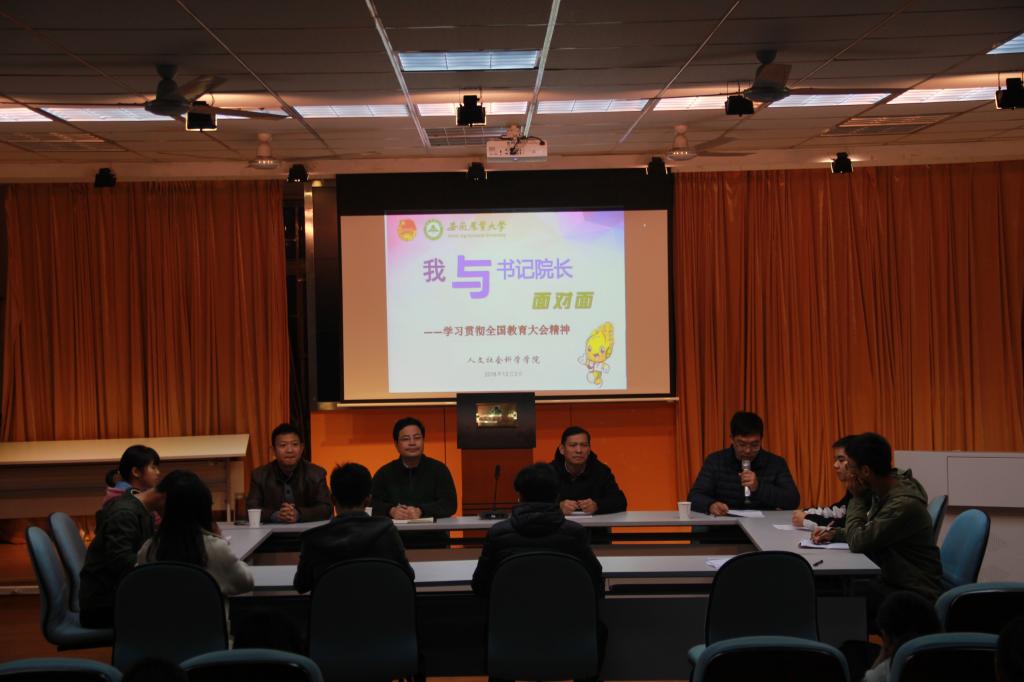 本网讯为深入学习领会全国教育大会精神,贯彻落实习近平新时代中国特色社会主义思想,抓好青年之声服务平台建设,倾听青年心声,整合学院教育教学资源,助力人文学子成长成才,12月3日晚,人文社会科学学院在人文楼602开展了“青年之声·我与书记院长面对面”暨学习领会全国教育大会精神活动。学院党委书记孙超、院长方章东、党委副书记吕大鹏出席活动,学院2016-2018级各专业学生代表、28期团干部培训班学员代表等80余人参加了此次座谈会。会议由学院团委老师主持。