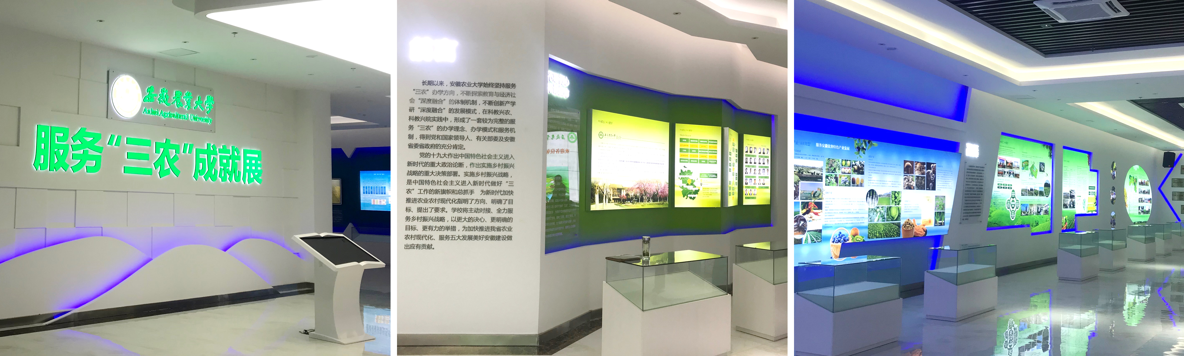 郭河综合试验站展厅总建筑面积八百多平方米,主题为“服务三农成就展”,主要展现了我校始终坚持服务“三农”办学方向,不断探索教育与经济社会“深度融合”的体制机制,不断创新产学研“深度融合”的发展模式,在科教兴农、科教兴皖实践中,形成了一套较为完整的服务“三农”的办学理念、办学模式和服务机制。展厅共分为五大部分,分别从校史、发展、团队、服务、未来等多个角度对服务“三农”情况进行阐述。我院结合自身专业特色,从展馆设计、灯光效果、展板规划等多方面进行工作,这是学院又一独立完成的设计项目,为今后更多的社会服务积累了丰富的设计经验。(殷石 通讯员:曹玮)