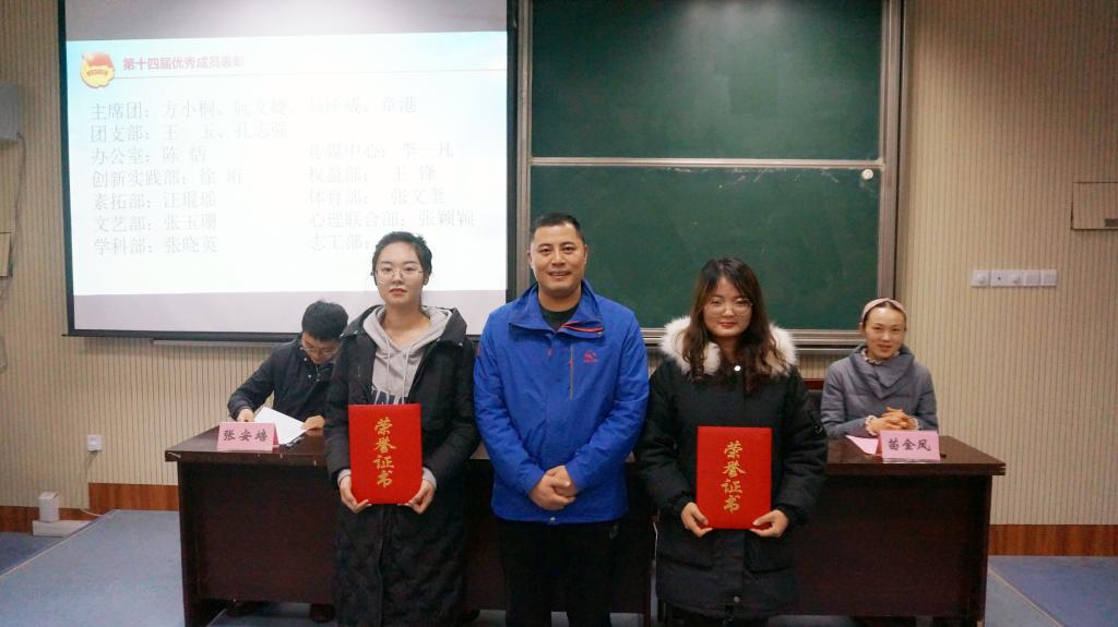 学生会同学通过PPT展示了第十四届学生会的重点工作和成绩,对老师精心的指导和学生会成员的不懈努力表示感谢。团委老师通报了本届学生会换届筹备情况,综合学习绩点、考勤考核、工作成效等方面,评选出方小桐等16名优秀学生干部和志工部、心理联合部2个优秀部门。会上,与会领导老师向受表彰的同学依次颁发了荣誉证书。第十五届学生会主席分享了在学生会工作中的感悟,介绍了新一届学生会的工作设想和决心,并表示将在继承发扬往届学生会优良传统的同时搭建新的舞台,扬长避短,团结一心,把学生会工作做得更出色。