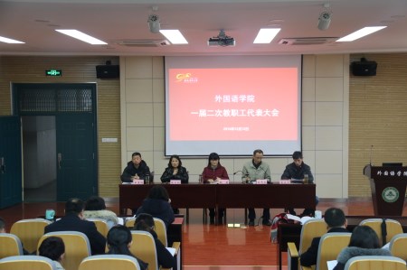 本网讯 12月12日下午,外国语学院一届二次教职工代表大会在外语楼502报告厅召开。学院教职工代表参加了会议,其他教职工列席会议。会议由学院党委副书记黄庆华主持。