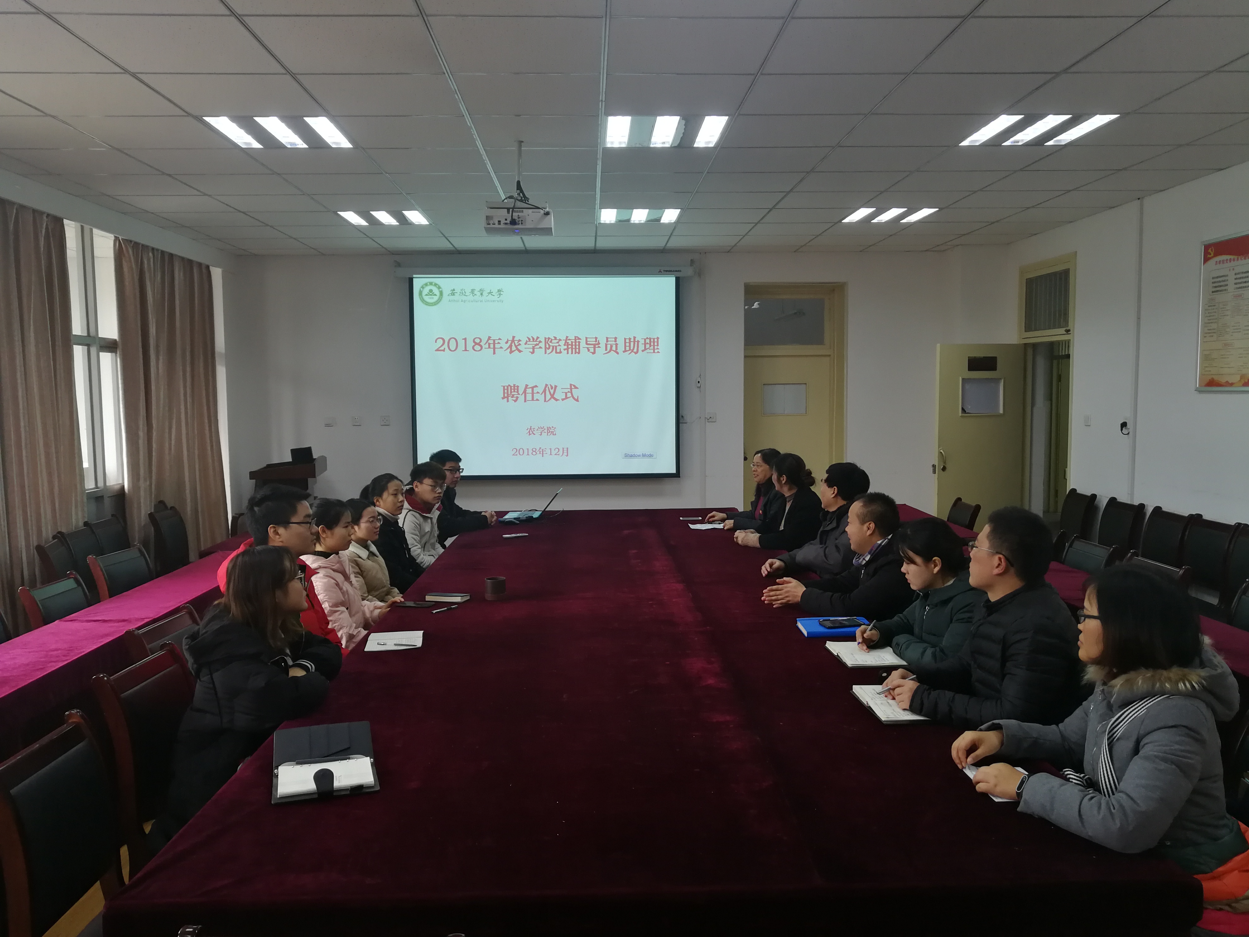 本网讯 为更好地协助大一班级辅导员工作,有效指导大一班级学生的学习、生活和工作,农学院推行了辅导员助理制度。12月14日,学院2018-2019学年辅导员助理聘书颁发仪式在十教518举行,学院党委书记汪凤莲,院长李金才,学院党委副书记、副院长鄢高翔,学院全体专兼职辅导员,学院18级全体辅导员助理出席了大会。