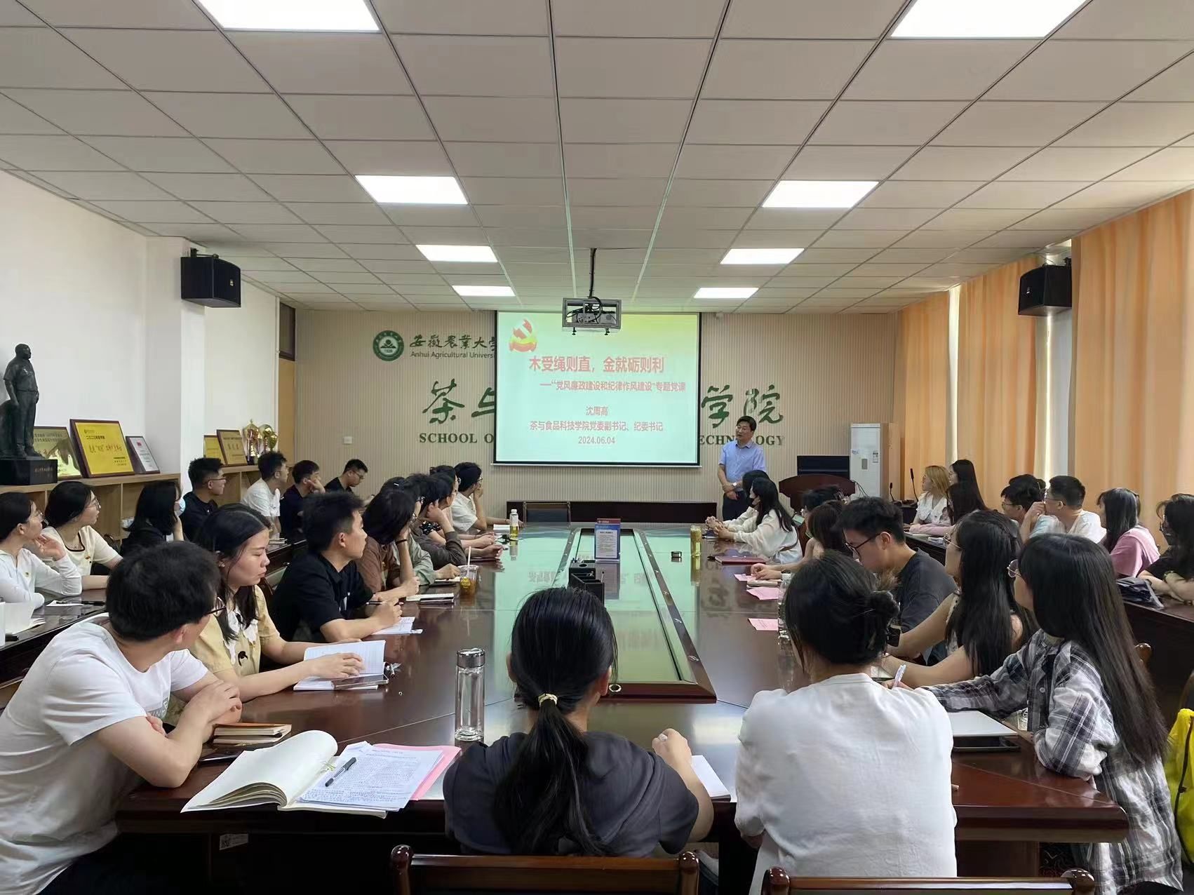 本网讯 6月4日上午,茶与食品科技学院在茶业楼221室开展2024届毕业生党员党纪学习教育暨文明离校教育大会,学院党委副书记、纪委书记沈周高,学生党支部书记、2024届全体在校毕业生党员参加了会议。