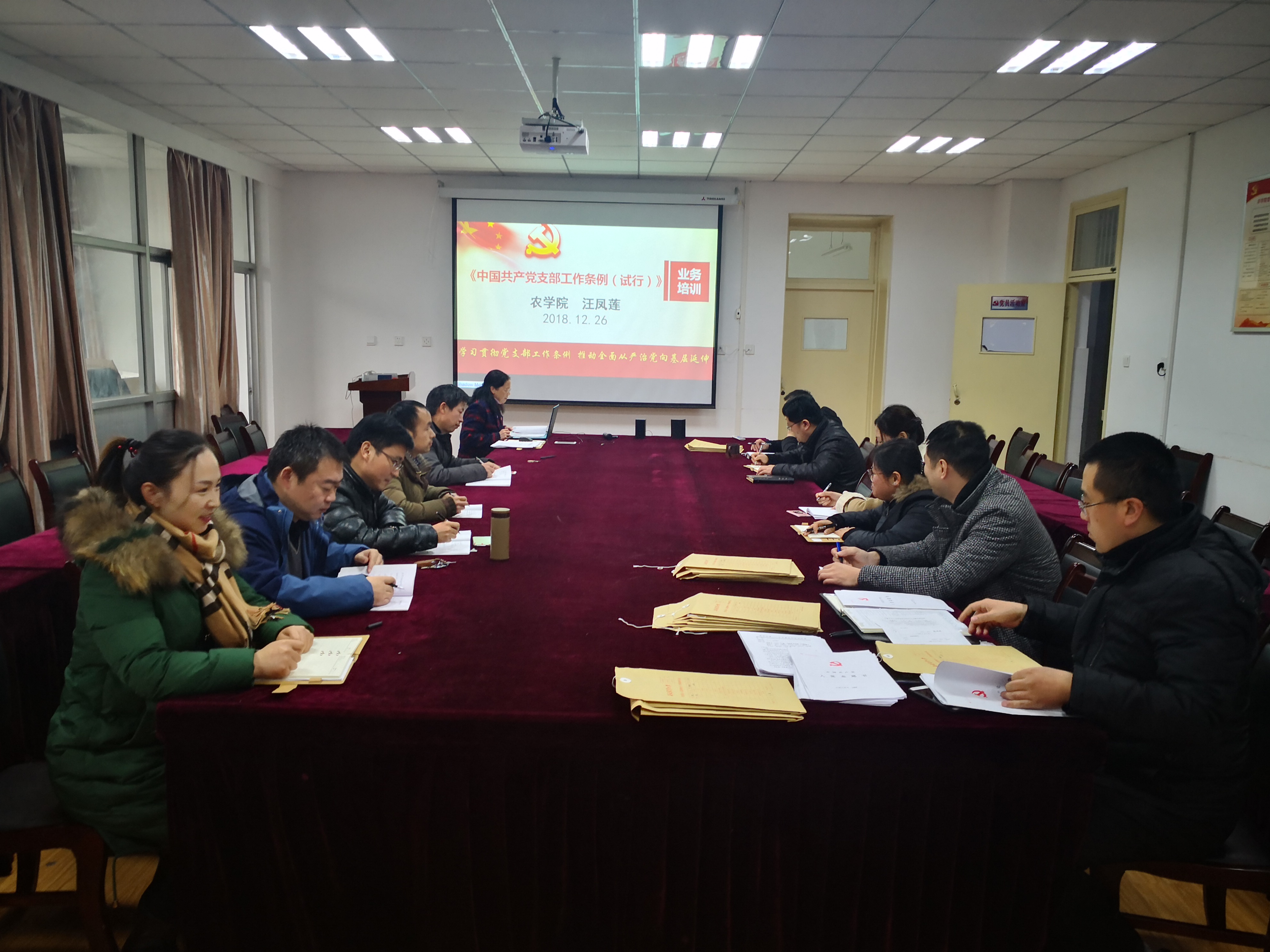 本网讯 为加强支部规范化建设,12月26日下午,农学院党委书记汪凤莲为学院各党支部书记、委员开展业务培训,主要内容是讲解《中国共产党支部工作条例(试行)》。