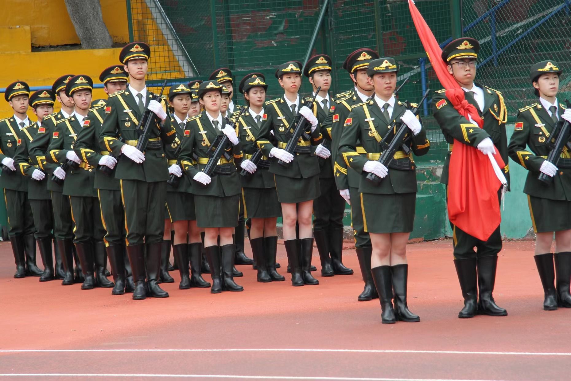 升旗仪式开始,国旗护卫队迈着铿锵的步伐,护卫着五星红旗来到升旗台,鲜艳的国旗迎着朝霞冉冉升起,全体师生行注目礼,怀着对祖国深沉的爱,齐声同唱中华人民共和国国歌。