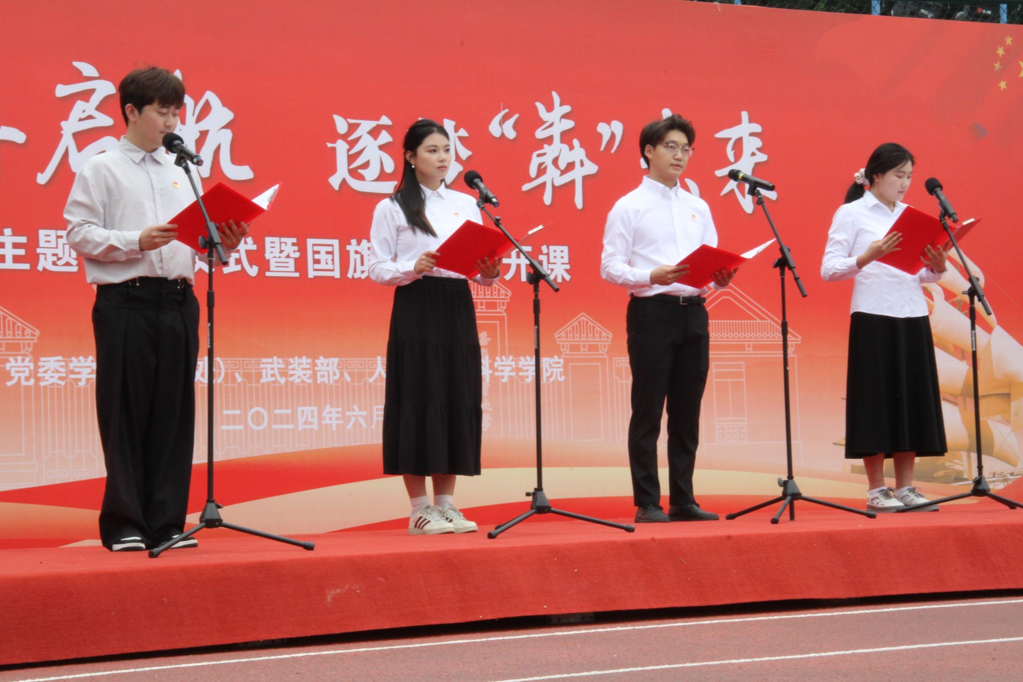 学院2024届毕业生邓鹏同学作“青春旗帜下,奋斗正当时”的主题演讲,分享了自己在校学习、生活与考取选调生的经历,呼吁新时代“人文人”要用青春汗水响应党的号召,志存高远、脚踏实地,厚植爱农情怀,练就兴农本领,在乡村振兴的大舞台上建功立业;胡星宇、张文杨、黄勖桐、刘颖等4位同学集体朗诵现代诗歌《青春扬帆正当时,争做时代追梦人》,深情歌颂伟大祖国取得的辉煌成就,用慷慨激昂的话语表达出青年学子对党、对祖国深沉的爱意。