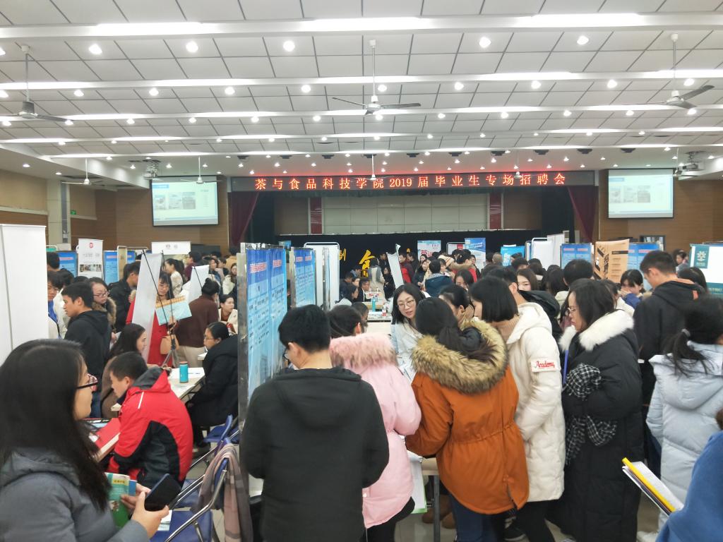本网讯12月28日上午,茶与食品科技学院2019届茶学食品类专场招聘会在欣苑食堂四楼成功举办。来自茶学、食品类及相关专业本科、硕士近500人参加了此次招聘会。校招生就业处负责人、茶食学院党政领导到招聘会现场指导,并与用人单位和求职毕业生进行了亲切交流互动。