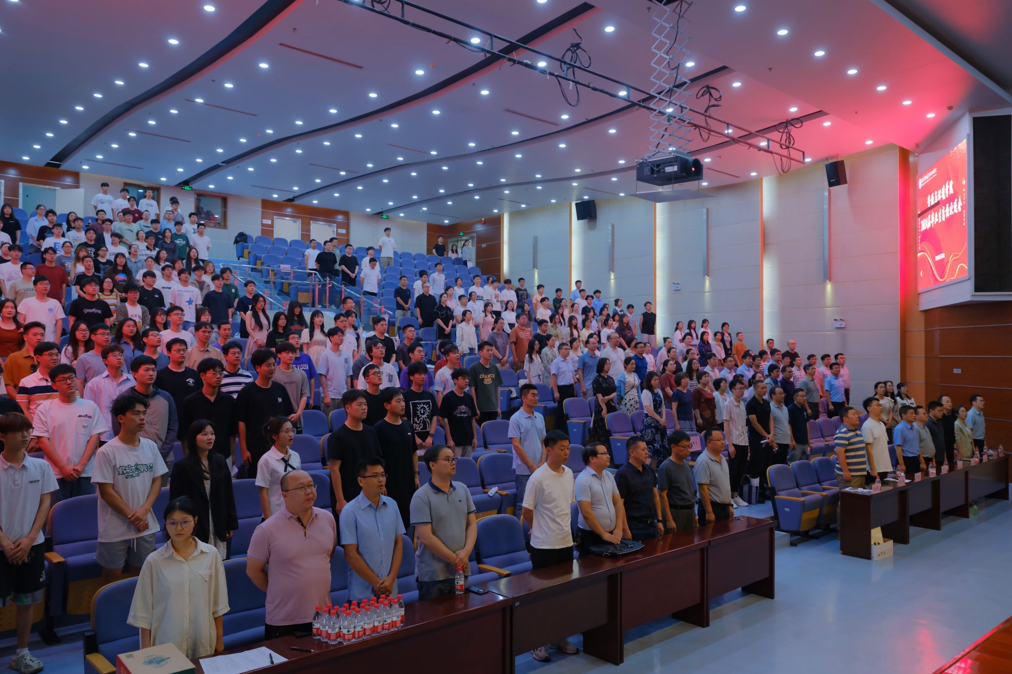 典礼伊始,全场起立,奏唱国歌。