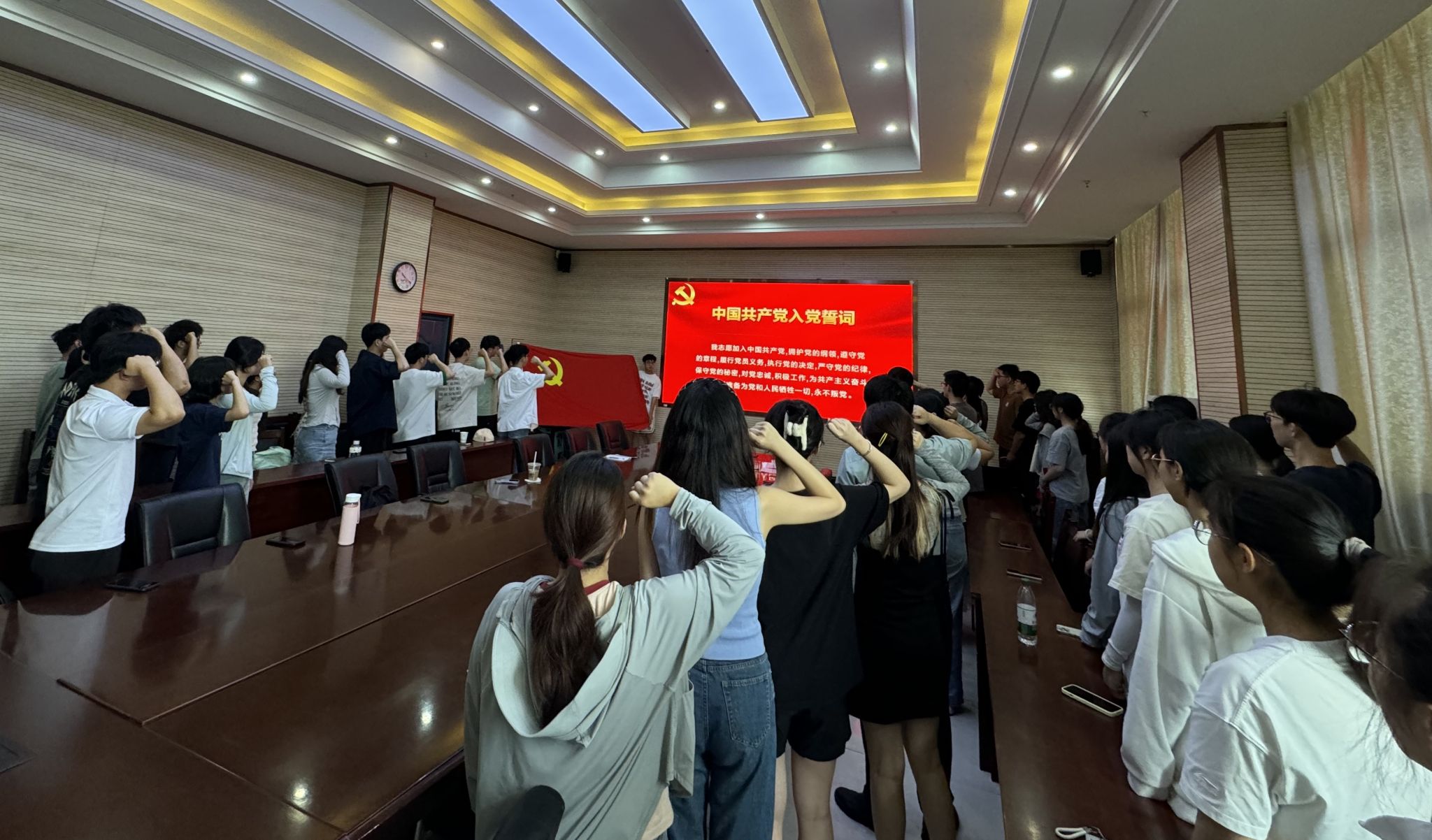会上,11名2021级本科正式党员分享了入党初心和申请入党以来思想与行动上的转变、个人先锋模范作用发挥等情况,与会人员为他们过了集体政治生日。与会党员教师、党员同学为今年春季新发展的预备党员佩戴了党员徽章,赠送了《中国共产党章程》,带领他们进行了入党宣誓。