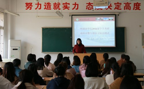 本网讯 为深入推进学风建设,进一步激发和调动广大学生考研的积极性,明确目标方向,3月15日下午,外国语学院在外语楼201教室举行了2016级学生考研动员会暨考研专用教室启用仪式。学院党委书记姚莉,院党委副书记黄庆华和2016级全体考研同学参加了会议。会议由学院办公室老师主持。