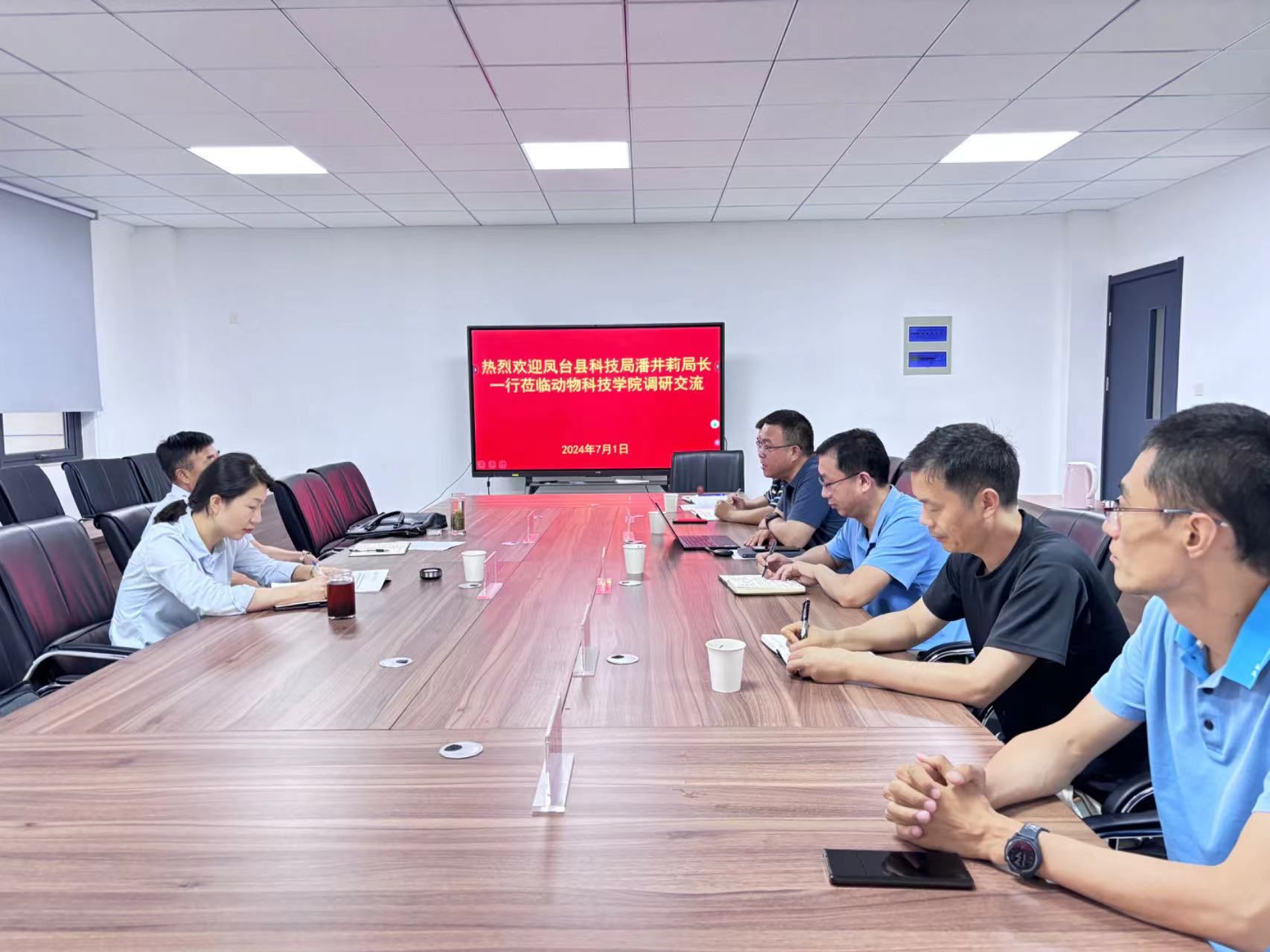 本网讯 7月1日,凤台县科技局局长潘井莉一行前来动物科技学院交流,学院副院长曹祖兵、肉牛产业研究院院长张运海、杨烈副教授、刘亚副教授和李运生副教授出席座谈会。