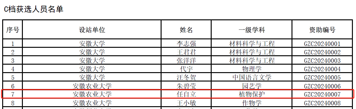 本网讯 近日,全国博士后管委会办公室、中国博士后科学基金会公布了2024年度国家资助博士后研究人员计划(B档、C档)获选人员名单,植物保护学院植物保护博士后流动站1人成果获得C档资助。项目负责人为在站博士后任自立,合作导师为操海群教授。