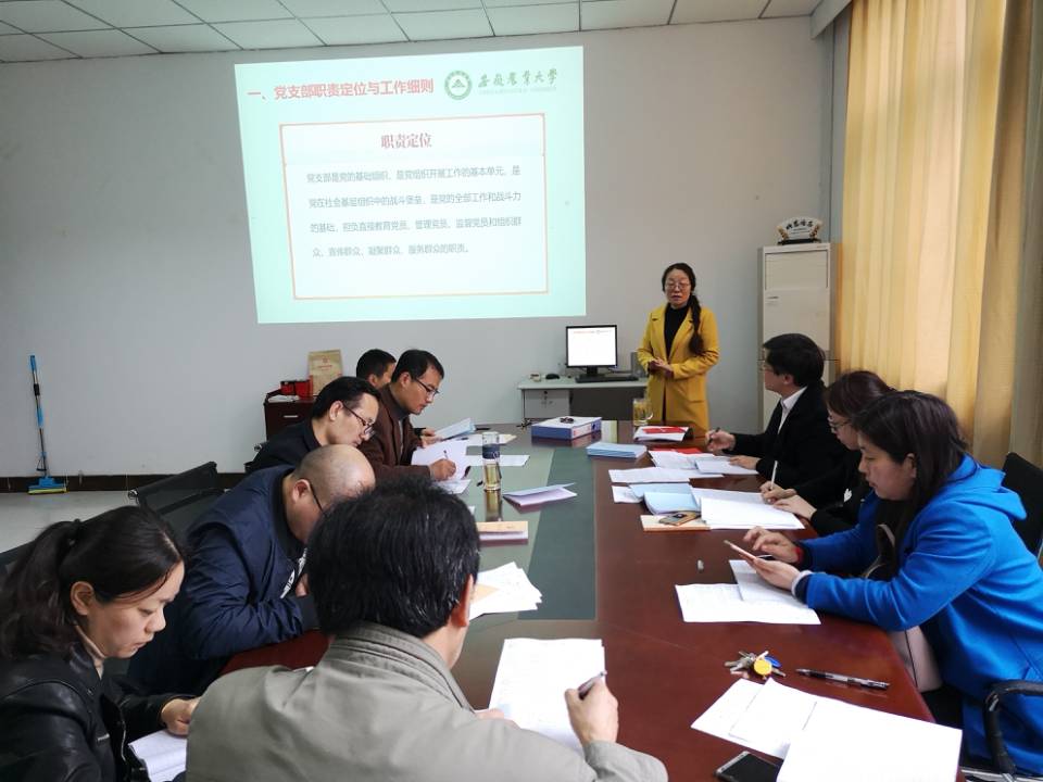 崔云首先从党支部的定位、职责、工作原则、基本任务等方面对《中国共产党支部工作条例(试行)》(以下简称《条例》)进行了具体阐述,她指出各位党员教师要充分认识并深刻领会《条例》出台的重要意义,《条例》的制定与实施是贯彻落实习近平新时代中国特色社会主义思想,加强新时代党支部建设的重要制度成果,是推动全面从严治党向基层延伸的重要基础;各位党员教师要增强贯彻执行《条例》的思想自觉和行动自觉,在实际工作中发挥党员先锋模范作用;党支部要按照《条例》要求,强化政治意识,激发组织活力,把基层党支部建设得更加坚强有力,让党的根基更加坚实牢固;要把政治建设放在首位,坚持立德树人,深入挖掘课堂教学中所蕴含的思想政治教育资源,结合食品学科专业特色,联系生活实际,抓好“课程思政”建设,把意识形态教育融入课程教学;党支部在开展活动时,要认真做好过程性材料积累,理论学习和实践活动一定要脚踏实地,落到实处。
