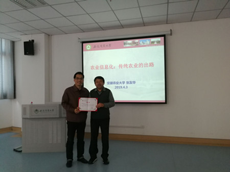 张友华在师生们热烈的掌声中开始了精彩的授课。他结合我省农业信息化发展现状,详细为大家介绍了以“互联网+”为代表的农业信息化发展及成效,他指出农业信息化相关政策体系基本形成,农业生产正在实现精细化、数字化、智能化,信息化在农业农村经济发展中具有重要的作用。