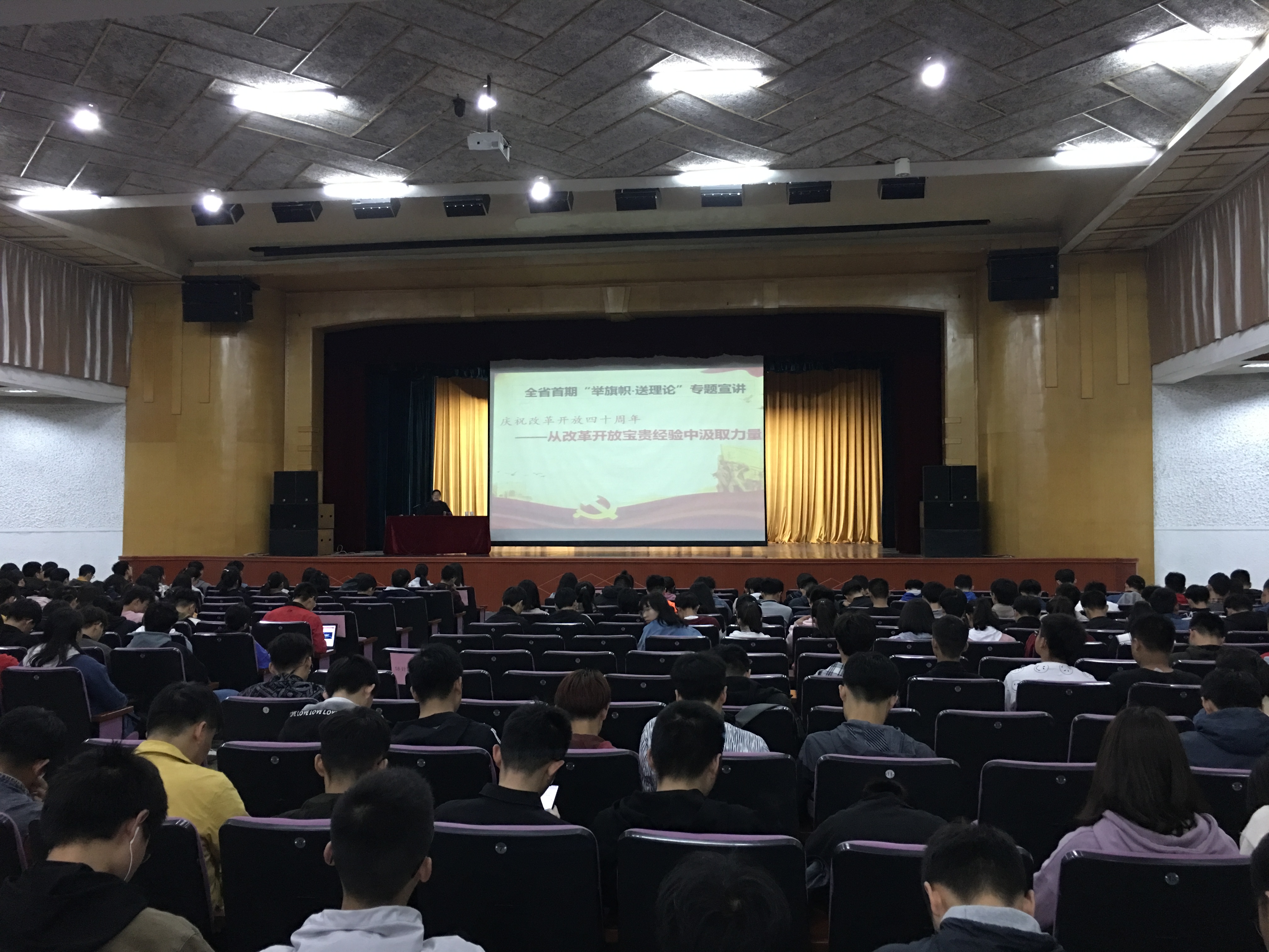 本网讯 4月9日晚,信息与计算机学院邀请安徽省委讲师团首批高端宣讲专家、省高校优秀思想政治课教师、我校人文社会科学学院党委书记孙超为2017级和2018级学生作《庆祝改革开放40周年——从改革开放宝贵经验中汲取力量》专题报告,带领信计学子们回顾改革开放以来取得的伟大成就,引导团员青年树立正确的价值观和人生目标,扣好人生第一粒扣子。学院青马班成员和两个年级近千名师生参加了报告。