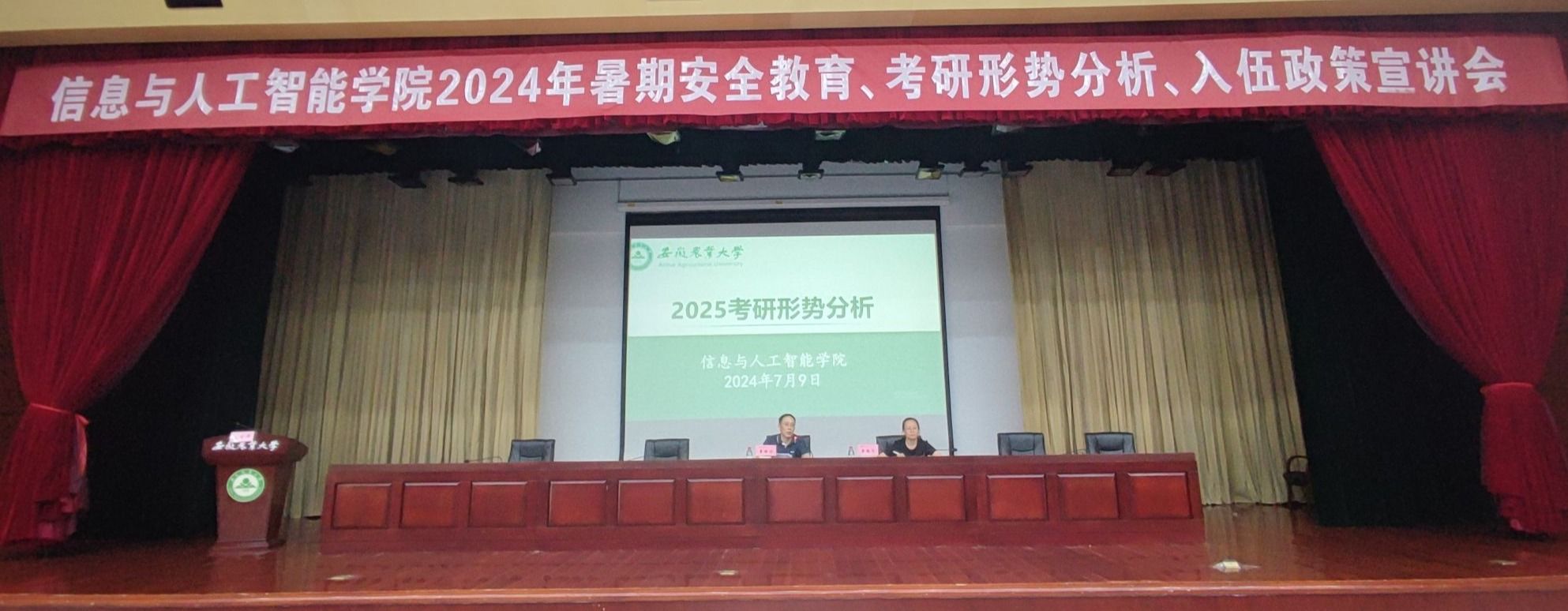 本网讯 7月9日下午,信息与人工智能学院在图书馆第一报告厅召开2024年暑期安全教育、入伍政策宣讲和2025年考研形势分析会。学院党委副书记、院长辜丽川,学院党委副书记、纪委书记李南飞、留宿学生辅导员以及全体暑期留宿学生参加会议。