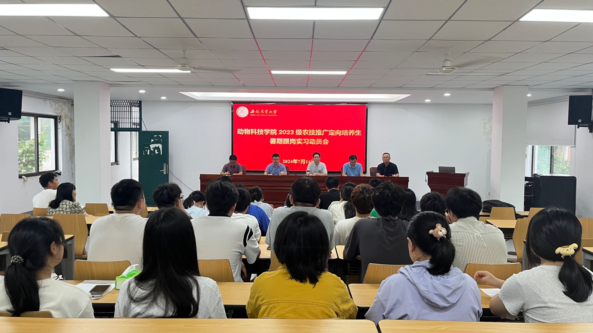 本网讯 7月14日,动物科技学院举行2023级农技推广定向培养动物科学、水产养殖学两个专业的暑期跟岗实习动员会,学院党委副书记章巍、副院长凌英会、副院长曹祖兵及动物科学系、水产系相关教师参加动员会。