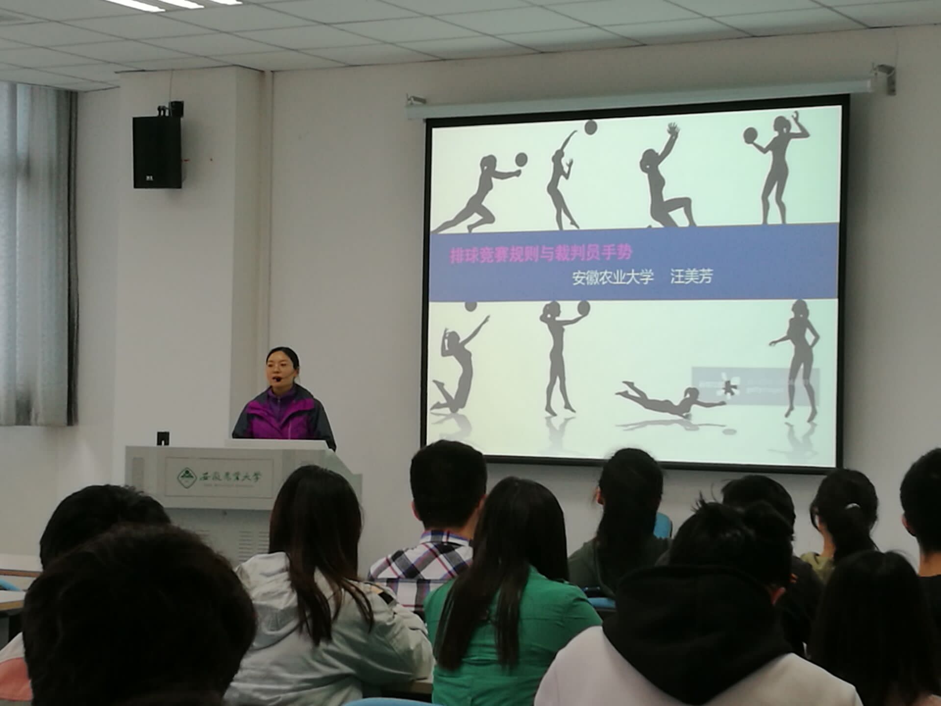 本网讯4月29日中午,学校排球裁判员培训班在校图书馆610教室开展,全校报名培训的90多位学生按时满勤参加培训,排球国家一级裁判员汪美芳带领全体学员学习了国际排联通过的2017-2020最新排球竞赛规则,并结合案例为学员们讲解执裁中容易出现的问题及解决方法。