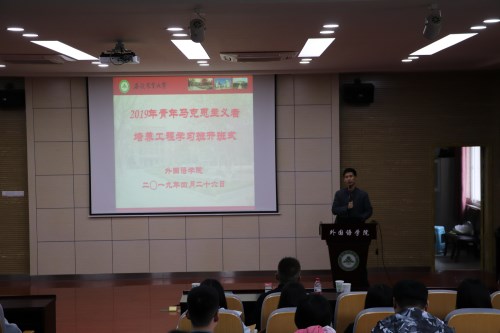本网讯 为深入学习宣传习近平新时代中国特色社会主义思想和党的十九大精神,进一步提高学生骨干的马克思主义理论水平、政治素质和业务素质,4月26日下午,学院在外语楼502报告厅举办2019年青马工程培训班开班仪式,学院党委副书记黄庆华、学生分会主要学生干部和各班级主要学生干部以及本学期学生发展对象等参加了开班仪式,开班仪式由学院办公室负责老师主持。