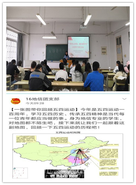 回溯光辉历史,重燃爱国热忱。4月下旬,2016级地理信息科学专业的全体团员集中观看了《青春万岁—纪念五四运动一百周年》纪录片,重温100年前那段激情燃烧的岁月。观影后,青年们结合专业知识,以团小组为单位,将五四运动的历程绘制成专题地图,从历史中汲取前行的力量,用历史的光芒照亮未来,进一步加深了对五四运动历史意义和时代价值的认识。
