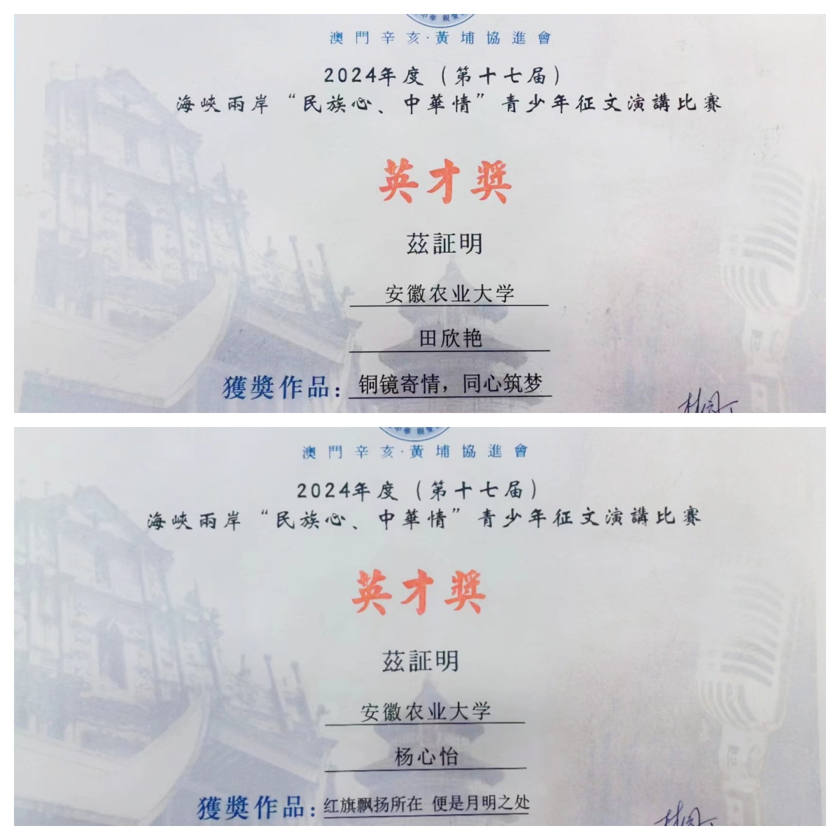 本网讯 7月11-14日,黄埔军校同学会与澳门辛亥·黄埔协进会共同主办的第十七届海峡两岸“民族心、中华情”青少年征文演讲比赛在澳门举办。我校2021级英语专业杨心怡和2023级汉语言文学专业田欣艳两位同学代表安徽省大学生参赛并获“英才奖”。