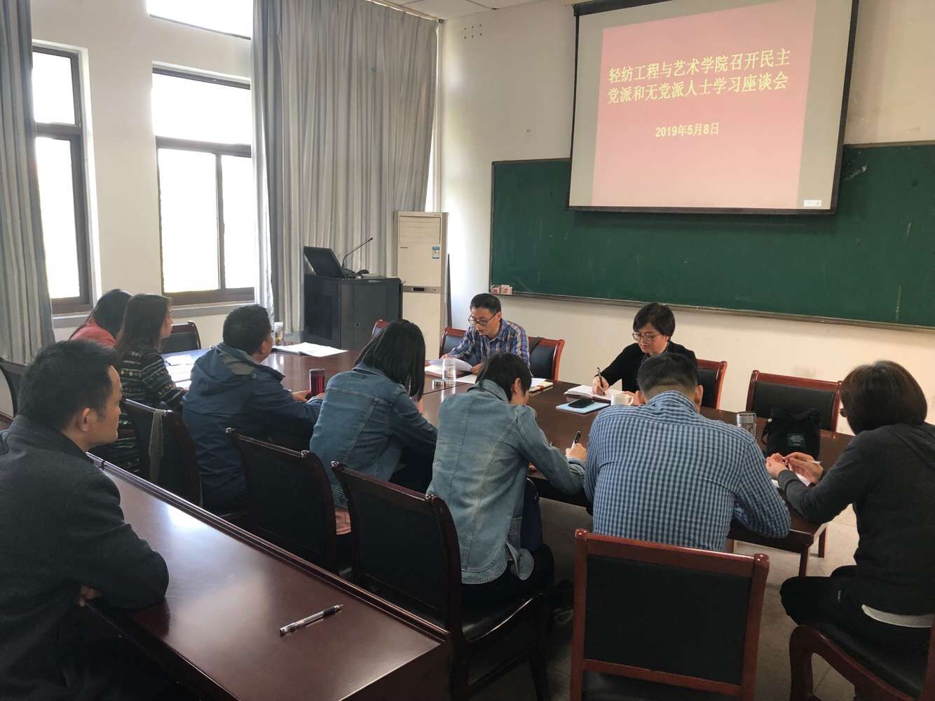 本网讯 5月8日,轻纺工程与艺术学院在院四楼会议室召开了以“弘扬爱国奋斗精神、建功立业新时代”为主题的民主党派和无党派人士学习座谈会。院长杜兆芳和学院全体党外知识分子参加了此次座谈会,会议由学院党委书记王冬平主持。