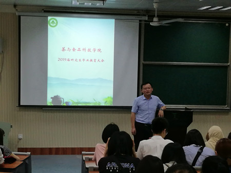 本网讯5月27日下午,茶与食品科技学院在茶业楼1992教室召开研究生毕业工作会议,学院党委副书记、纪委书记、副院长张国学,副院长李大祥及学院负责研究生教育、培养管理的老师参会,2019届全体毕业研究生参加了会议。张国学在会上传达了研究生校院二级管理相关文件精神,指出今年是学校深化研究生教育改革、做好研究生校院二级管理的起始年,学院作为落实此项工作的具体单位,根据相关文件要求,不断完善有关管理制度,做好交接,推进相关毕业工作稳定有序地开展。张国学指出,研究生作为学院科技创新的生力军,在做好科研的同时,也要为低年级本科生树榜样、作表率,以健康文明的方式告别母校,给母校留下好风尚,给老师留下好印象,给同学留下好形象,希望研究生毕业生能够坚定理想信念,明确奋斗目标,科学规划人生。
