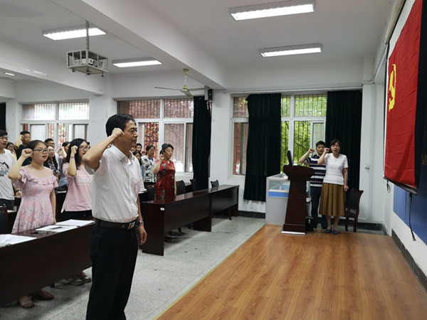 大会在庄严的《国歌》声中拉开序幕。全体党员在栾敬东的带领下,庄重举起右手,面对鲜红的党旗进行宣誓,铭记党员身份。