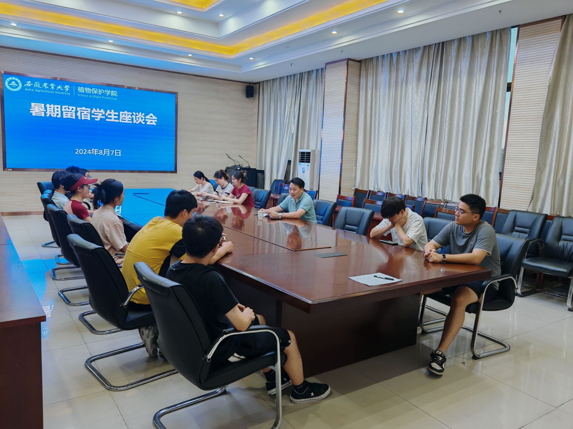 本网讯 8月7日,植物保护学院在中西部综合楼1213会议室召开暑期留宿学生座谈会,留宿本科生和研究生代表参加,会议由学院党委副书记汪小强主持。
