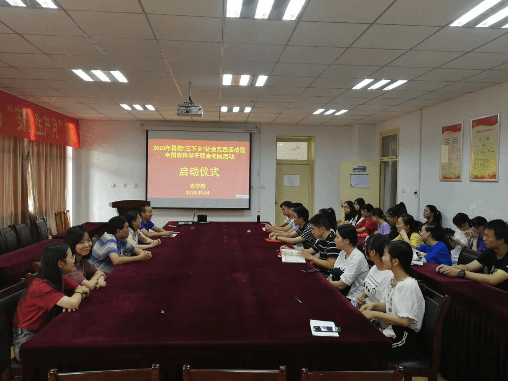本网讯7月4日上午,农学院2019年全国农科学子联合实践暨暑期“三下乡”社会实践活动出征仪式在十教518举行,院党委书记汪凤莲,院长李金才,院党委副书记、副院长鄢高翔,院团委老师及各实践团队成员参加了仪式。
